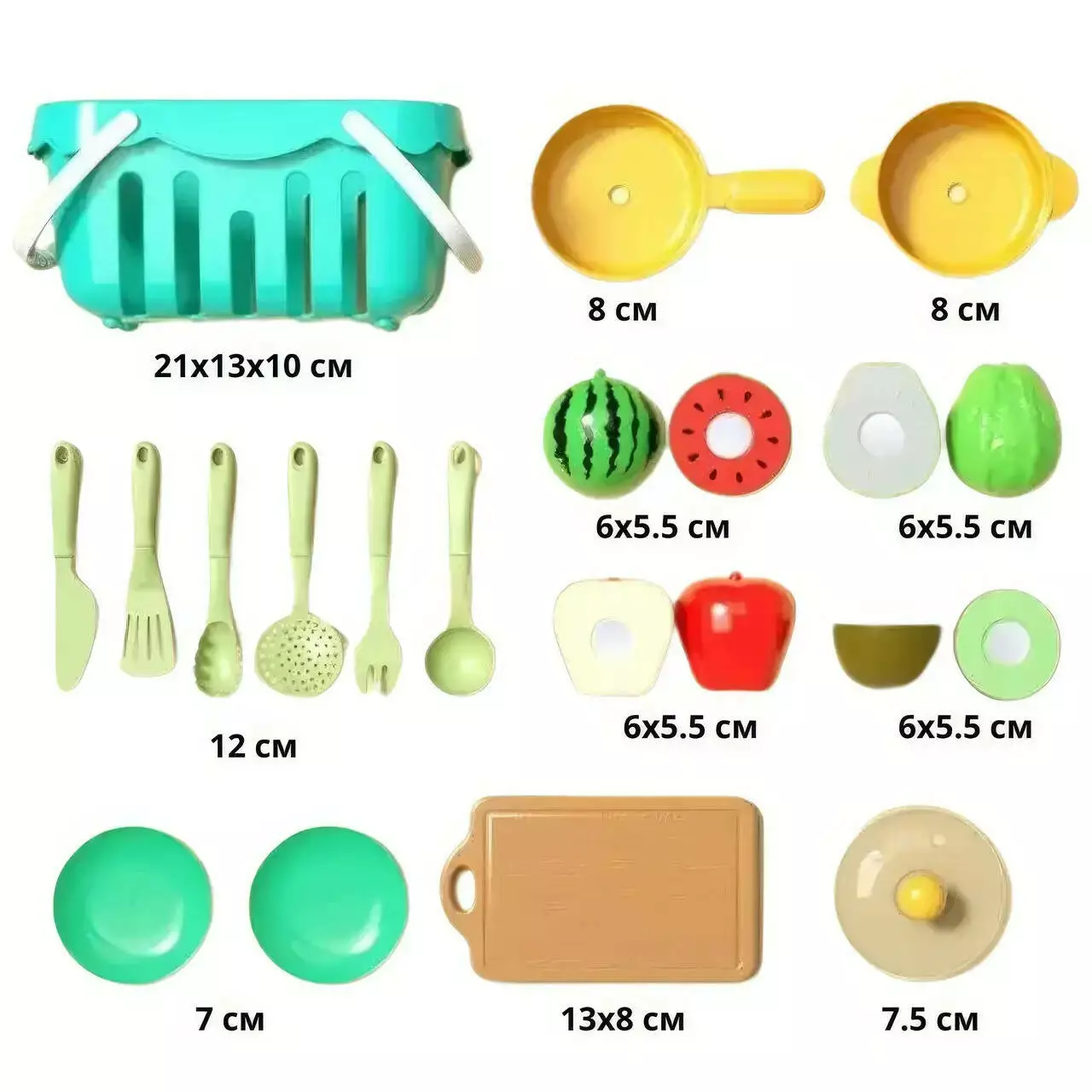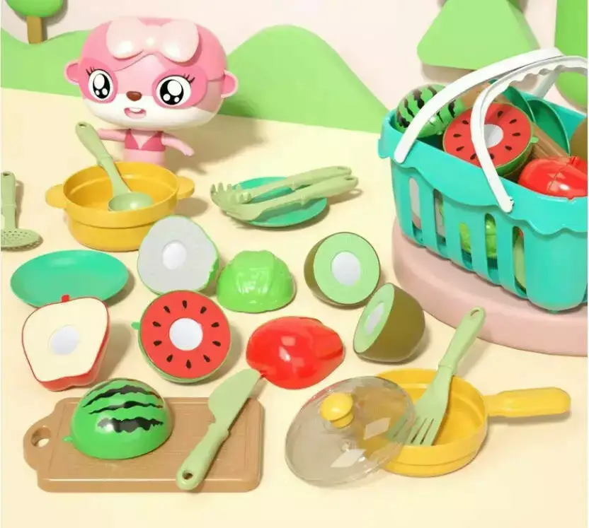 Набор фруктов пластиковых для детей, набор юных кулинаров + корзинка и столовые приборы,17 предметов