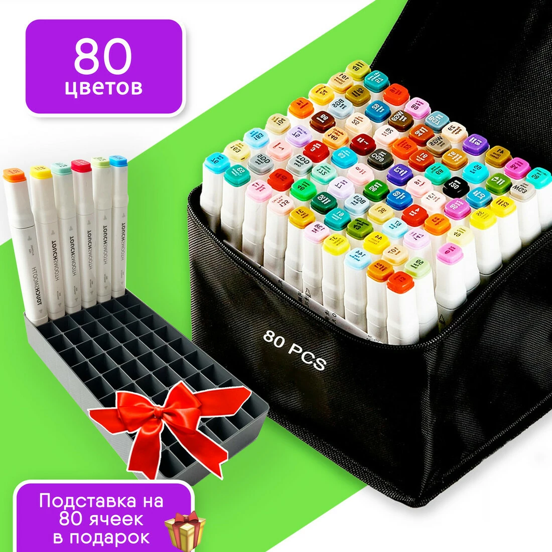 В наборе 80 маркеров разных цветов,подставка и сумка.
