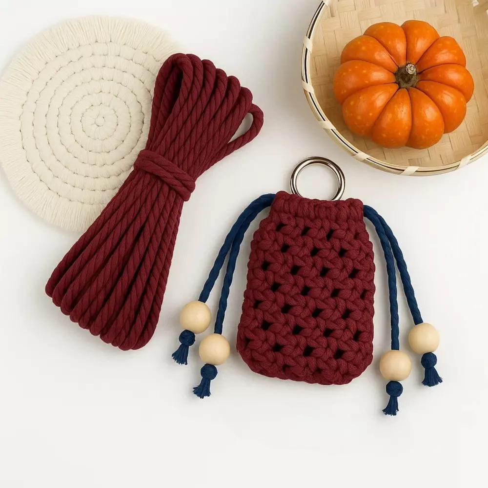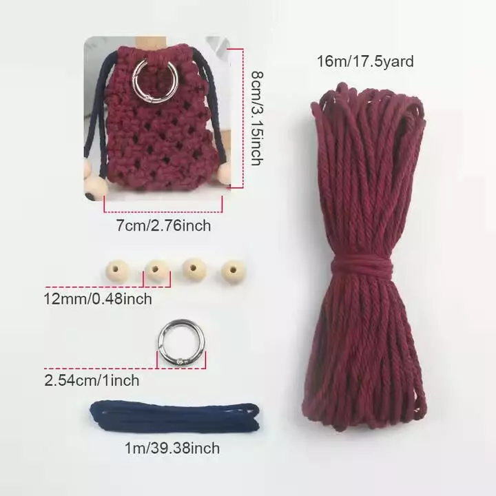 В комплект входят бордовые хлопковые вязаные нити, тёмно-синяя нить для затяжки, деревянные бусины, металлическое кольцо для подвешивания и пошаговая инструкция по вязанию.