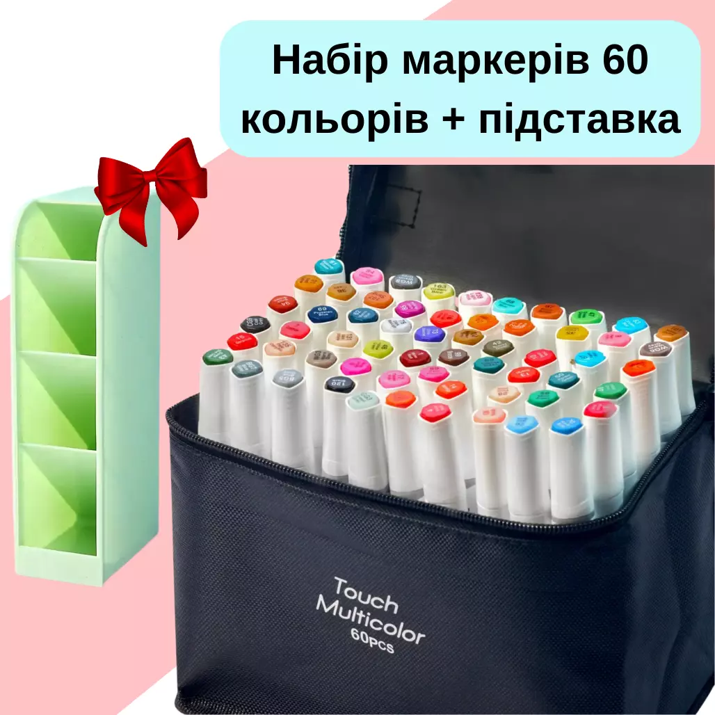 Набор маркеров двухсторонних,спиртовые Touch Multicolor 60 шт для рисования+ Подставка для маркеров зелёная