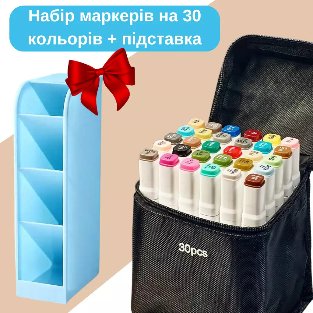 Набор маркеров двусторонних спиртовых для рисования Touch Smooth 30 шт + Подставка для маркеров голубой