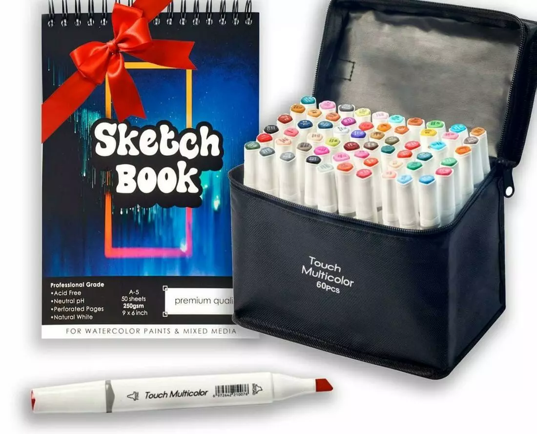 Набор маркеров двусторонних Touch Multicolor 60 шт +Альбом для скетчинга А5, Набор фломастеров для художников