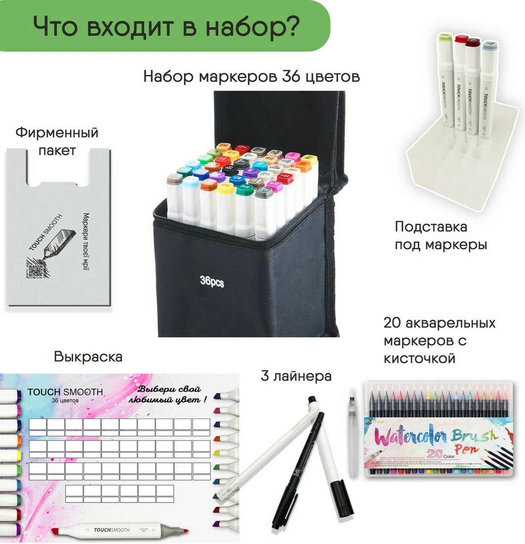 Вы покупаете Набор двусторонних маркеров Touch Smooth для скетчинга на спиртовой основе 36 шт и вместе с ними получаете Набор акварельных маркеров Water Color Brush маркер - кисточка 20 цветов