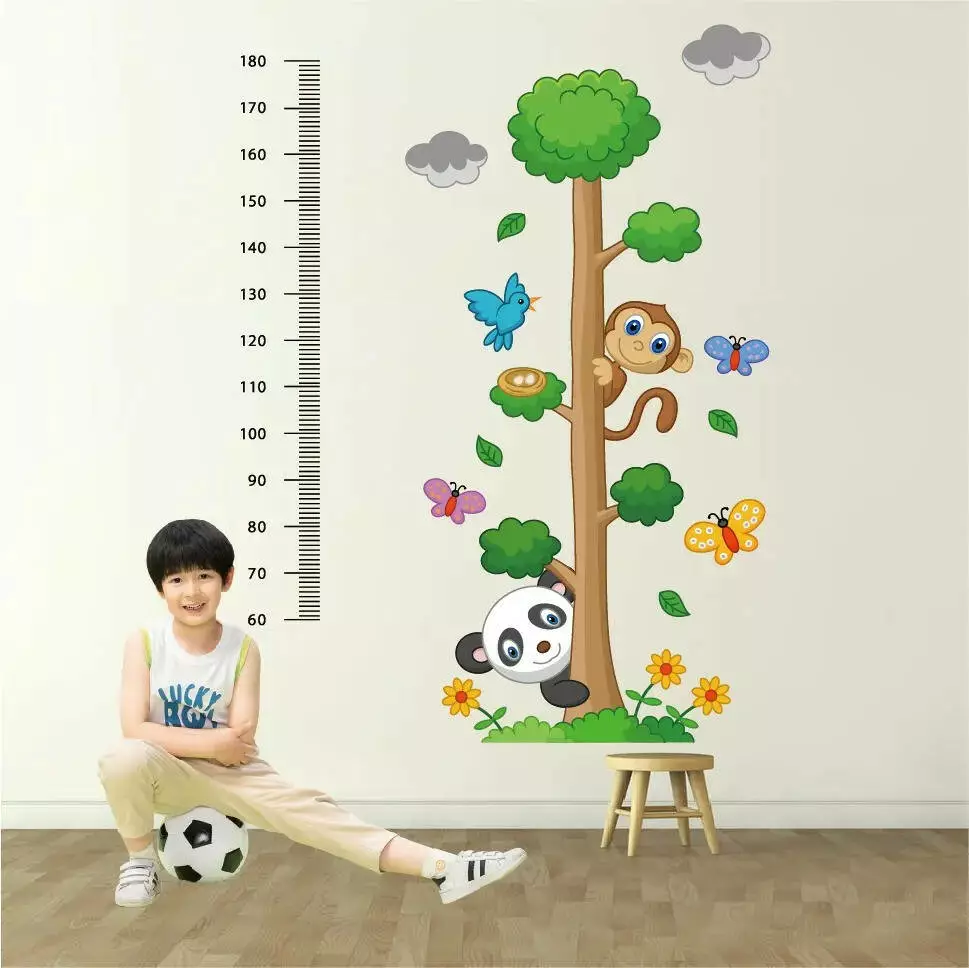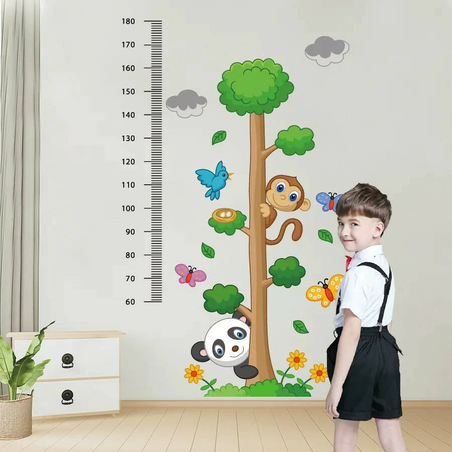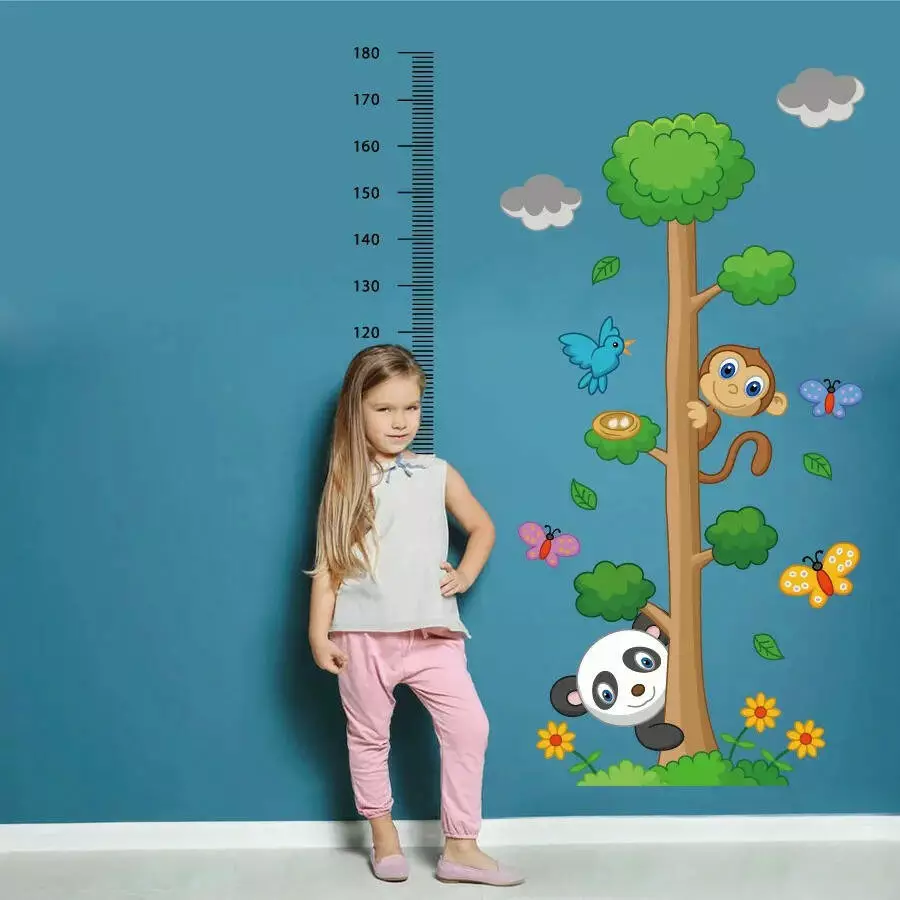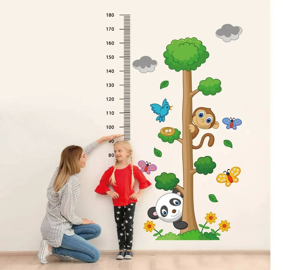Основной акцент набора – это мерная шкала роста от 60 до 180 см, которая помогает детям и родителям с легкостью отслеживать, как растут малыши. Шкала дополнена яркими деталями рядом на дереве сидит забавная обезьянка, а вокруг нее порхают бабочки и птицы. В нижней части композиции уютно расположилась милая панда, которая выглядывает с озорным интересом.