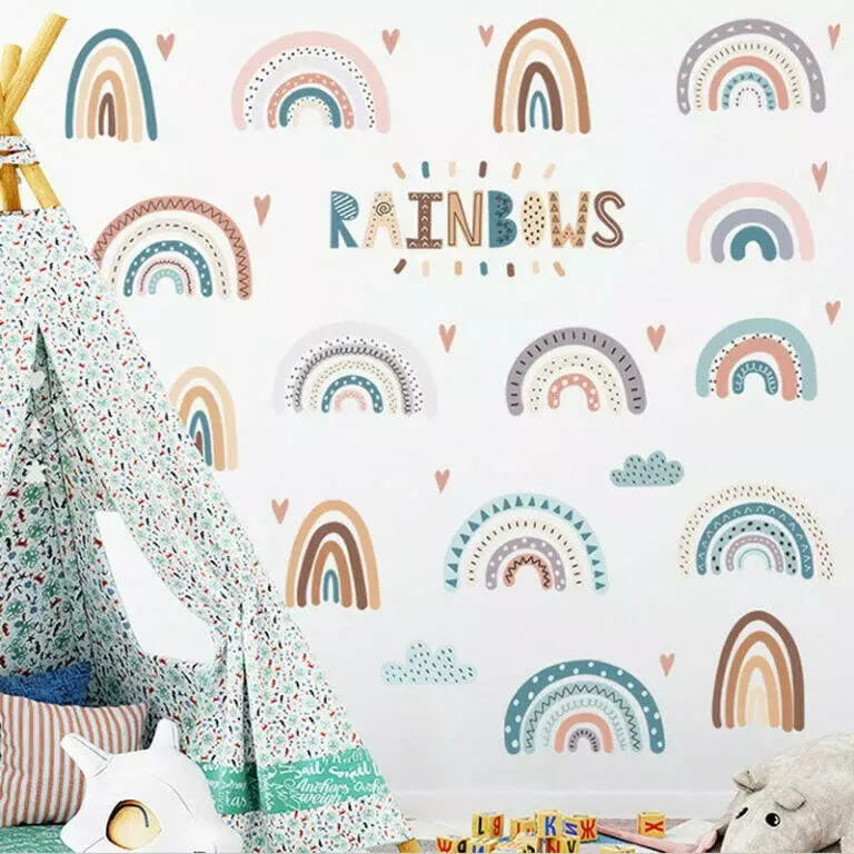 Этот набор станет универсальным решением для декора комнаты как для мальчиков, так и для девочек. Надпись "Rainbows" добавляет элегантности и завершенности композиции, подчеркивая радужную тематику. Благодаря разнообразию форм и размеров, каждая наклейка может быть размещена в индивидуальном порядке, создавая уникальные и креативные композиции.