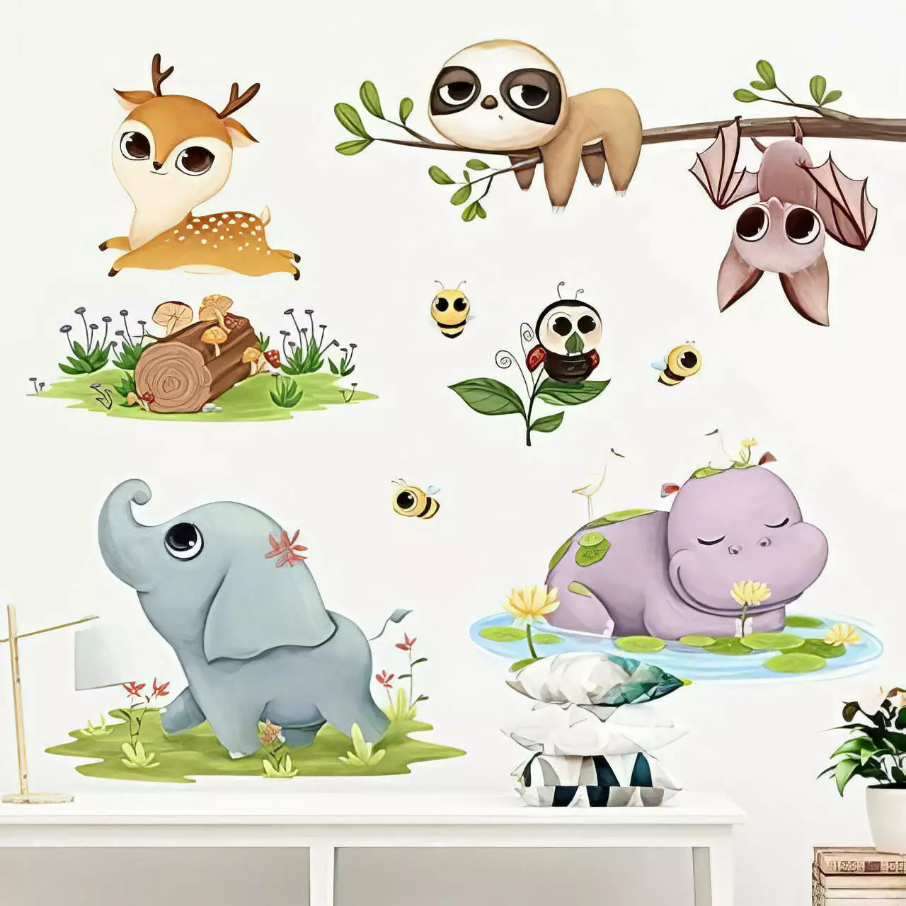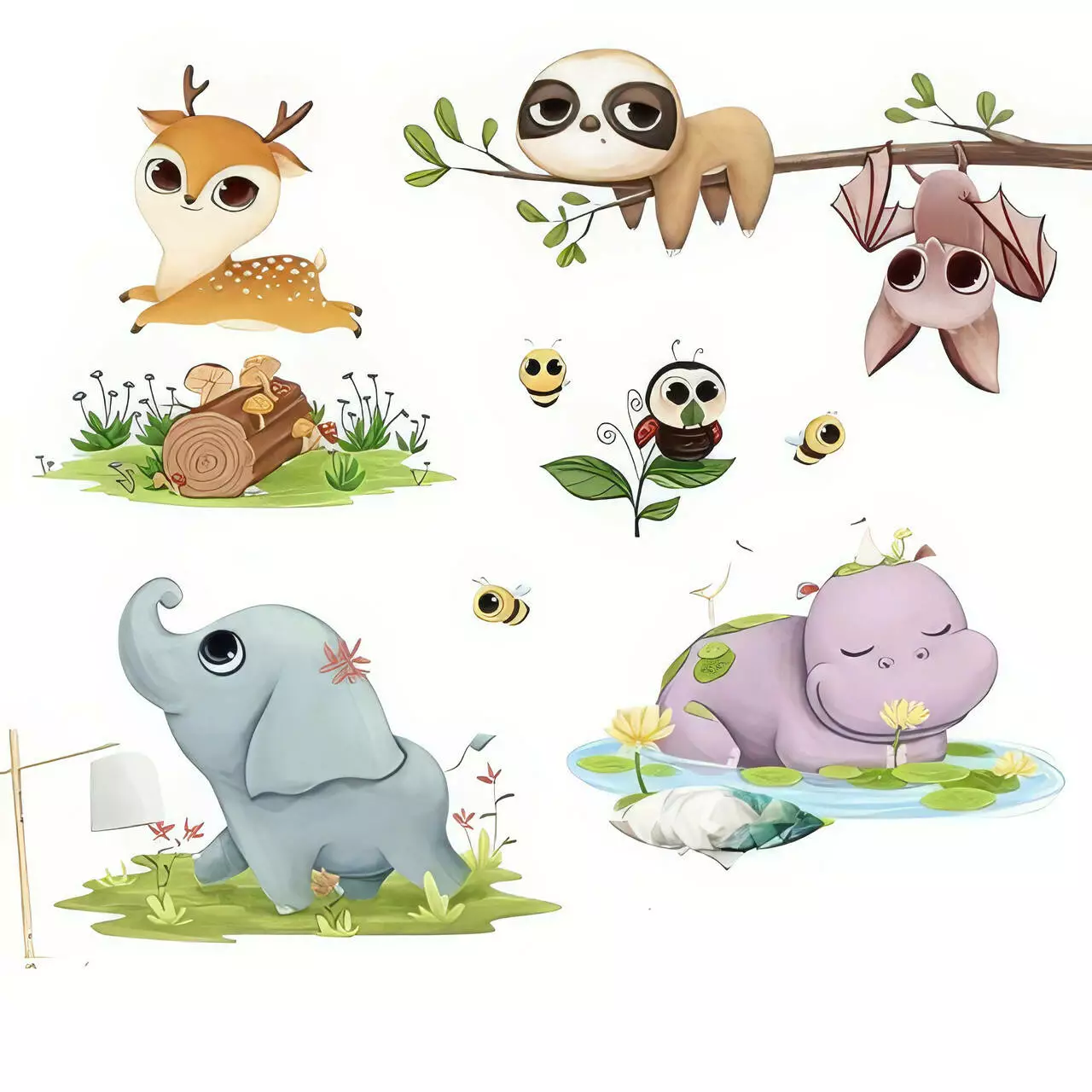 Изображения: слоник, бегемотик, оленёнок, божья коровка, пчелки, ленивец, летучая мышь.