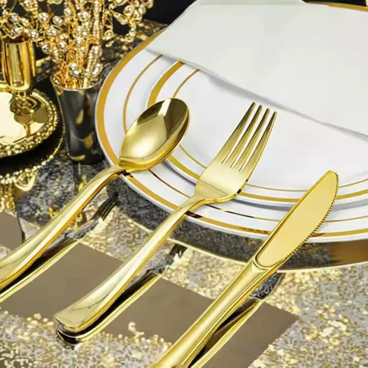 Набор пластиковых столовых приборов 18 шт качественных (ножи,вилки, ложки).Многоразовая посуда, золотые