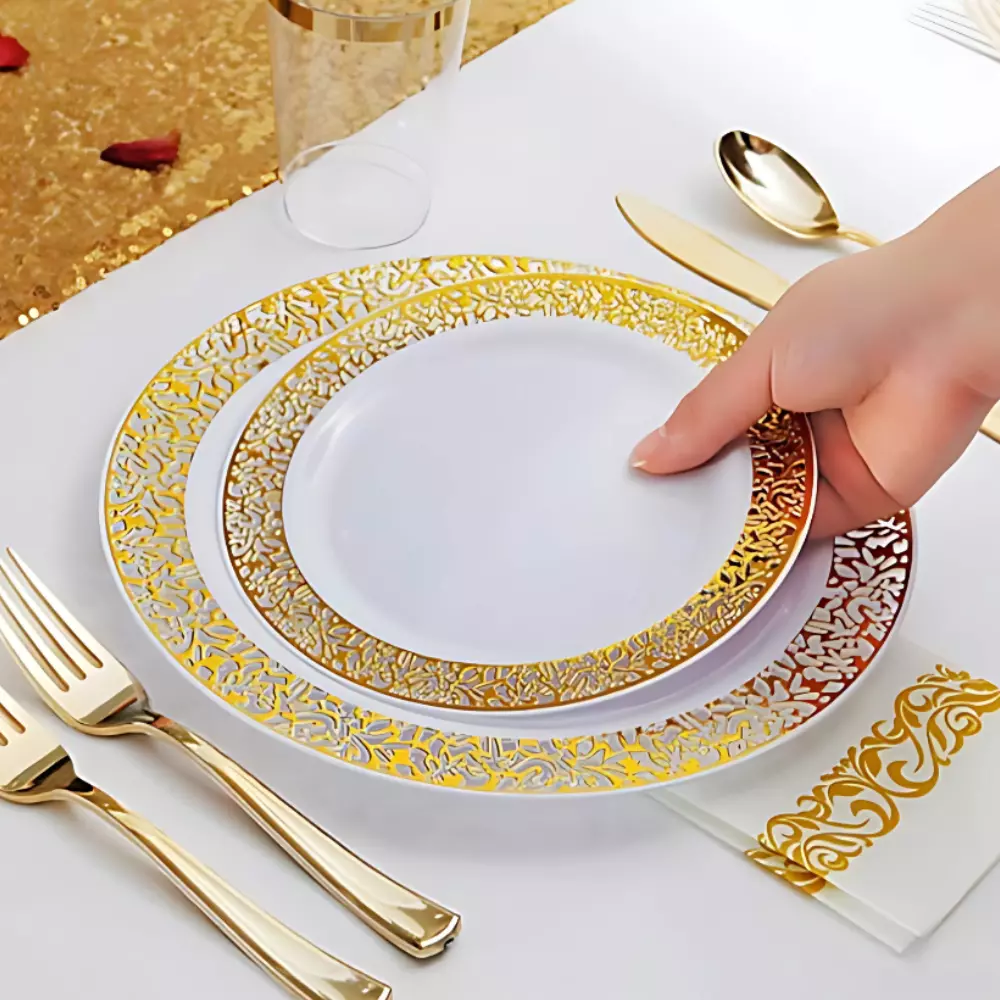Тарелки выполнены из прочного пластика высокого качества, устойчивого к повреждениям и легко очищаемого. Легкие и удобные в использовании, они подходят для сервировки как горячих, так и холодных блюд. Этот набор обеспечит не только комфорт, но и стильную атмосферу на любом торжестве.