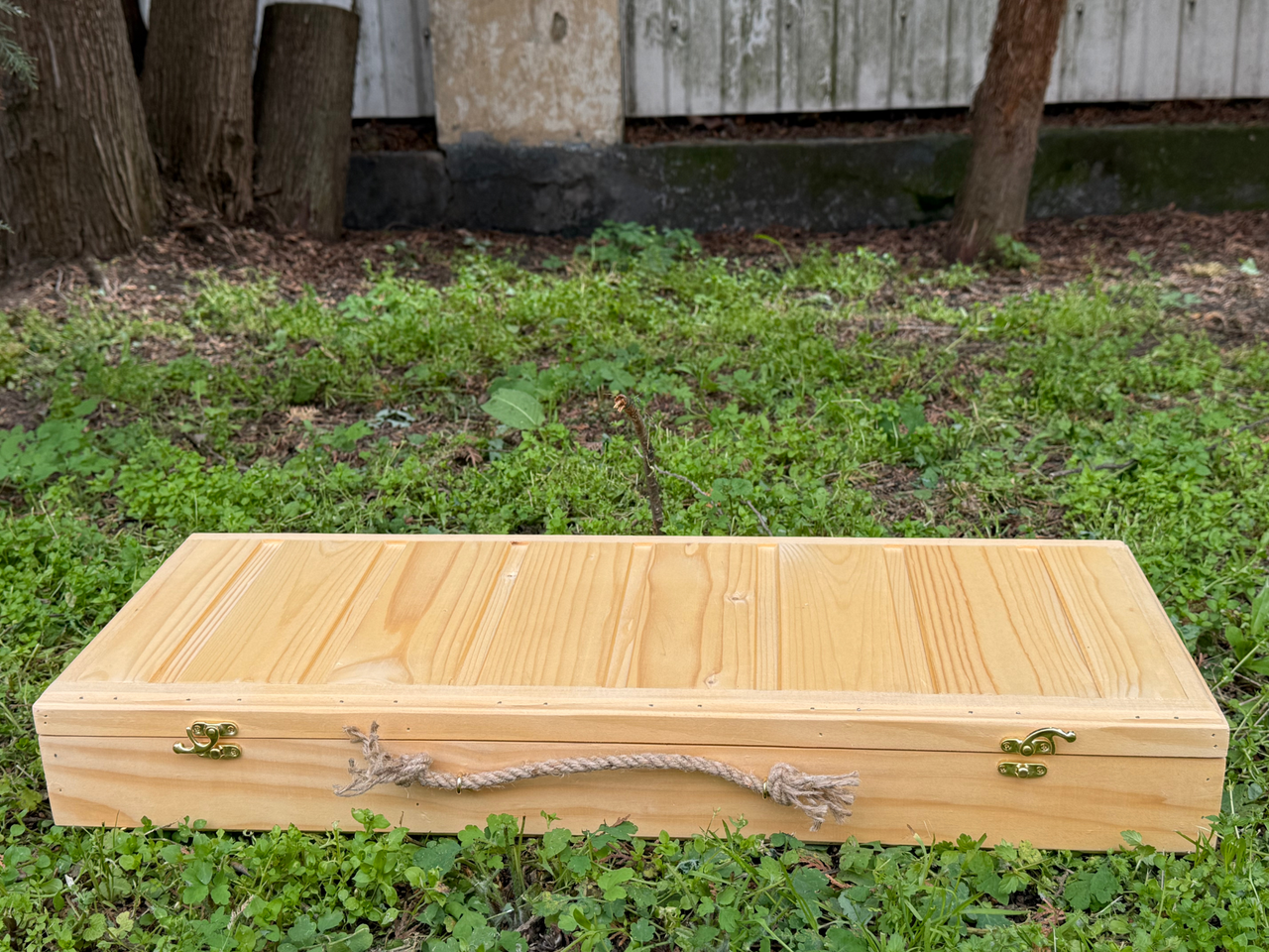 Упаковка: деревянный кейс с ручкой из каната и 2 металлическими замками