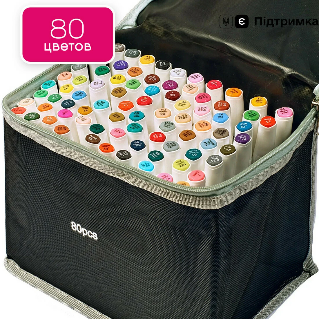 В наборе 80 маркеров разных цветов. Корпус пластиковый, гладкий. Колпачки плотно закрываются.