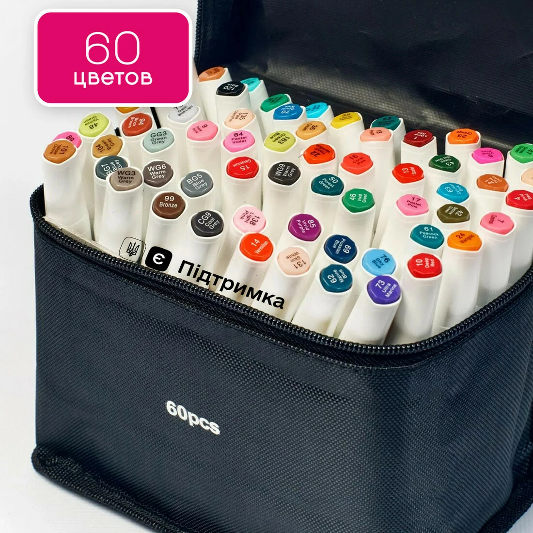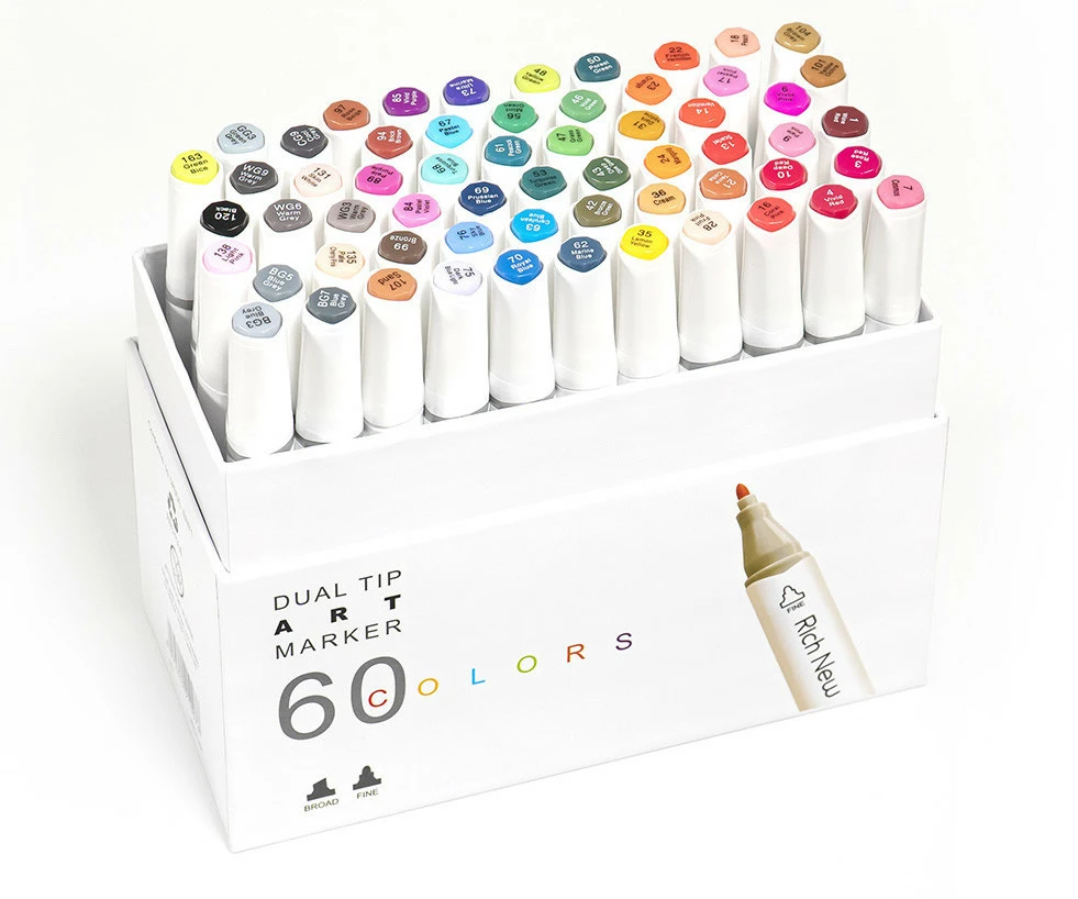 Набор профессиональных маркеров двусторонних 60 штук Rich New для рисования и скетчинга на спиртовой основе