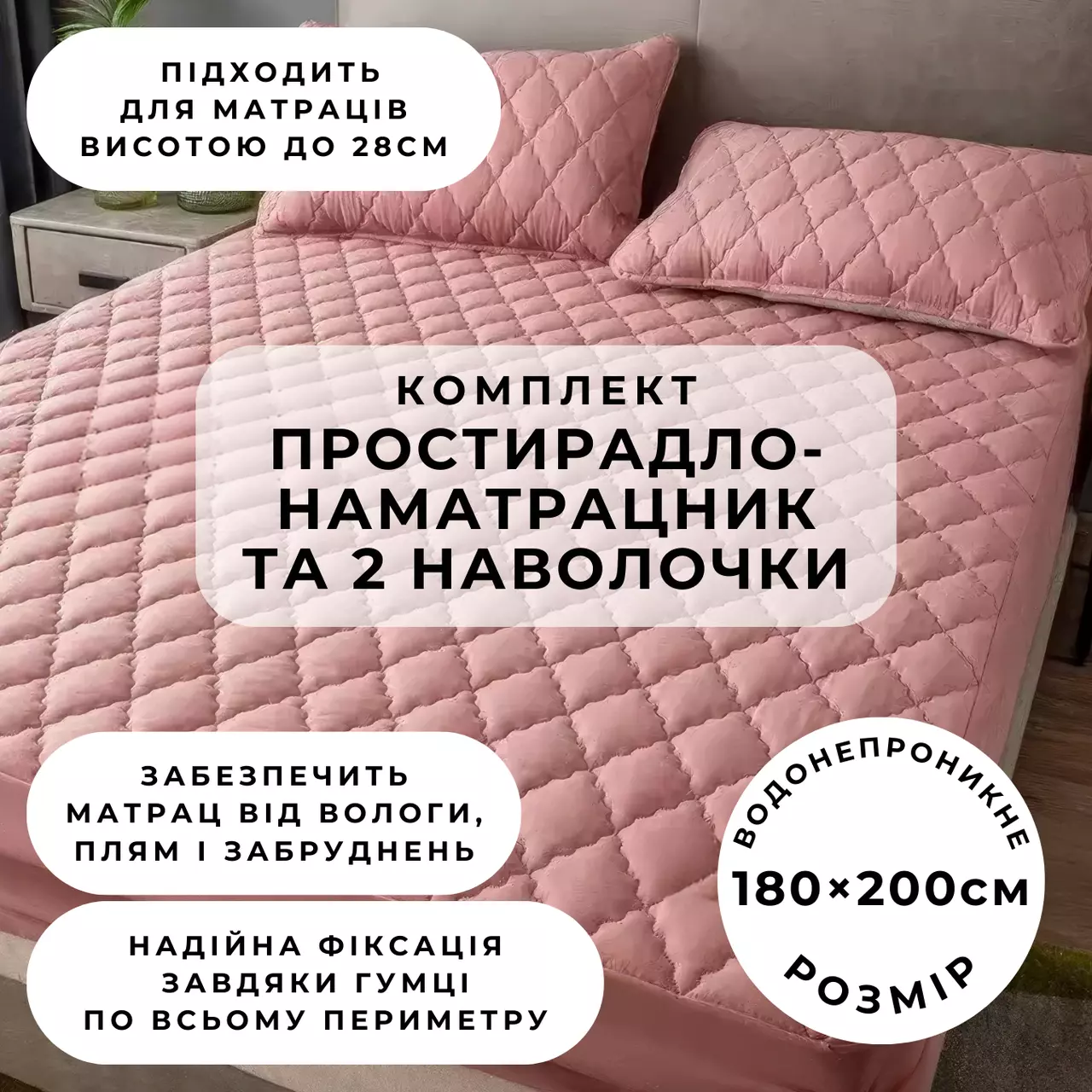 Набор простыня-наматрасник (180×200см) водонепроницаемая на резинке, и 2 наволочки, в розовом цвете
