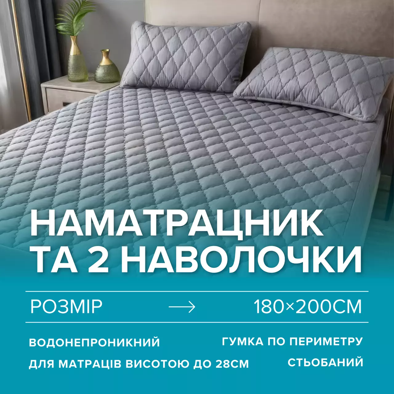 Набор простыня-наматрасник (180×200см) водонепроницаемая на резинке, и 2 наволочки, в сером цвете