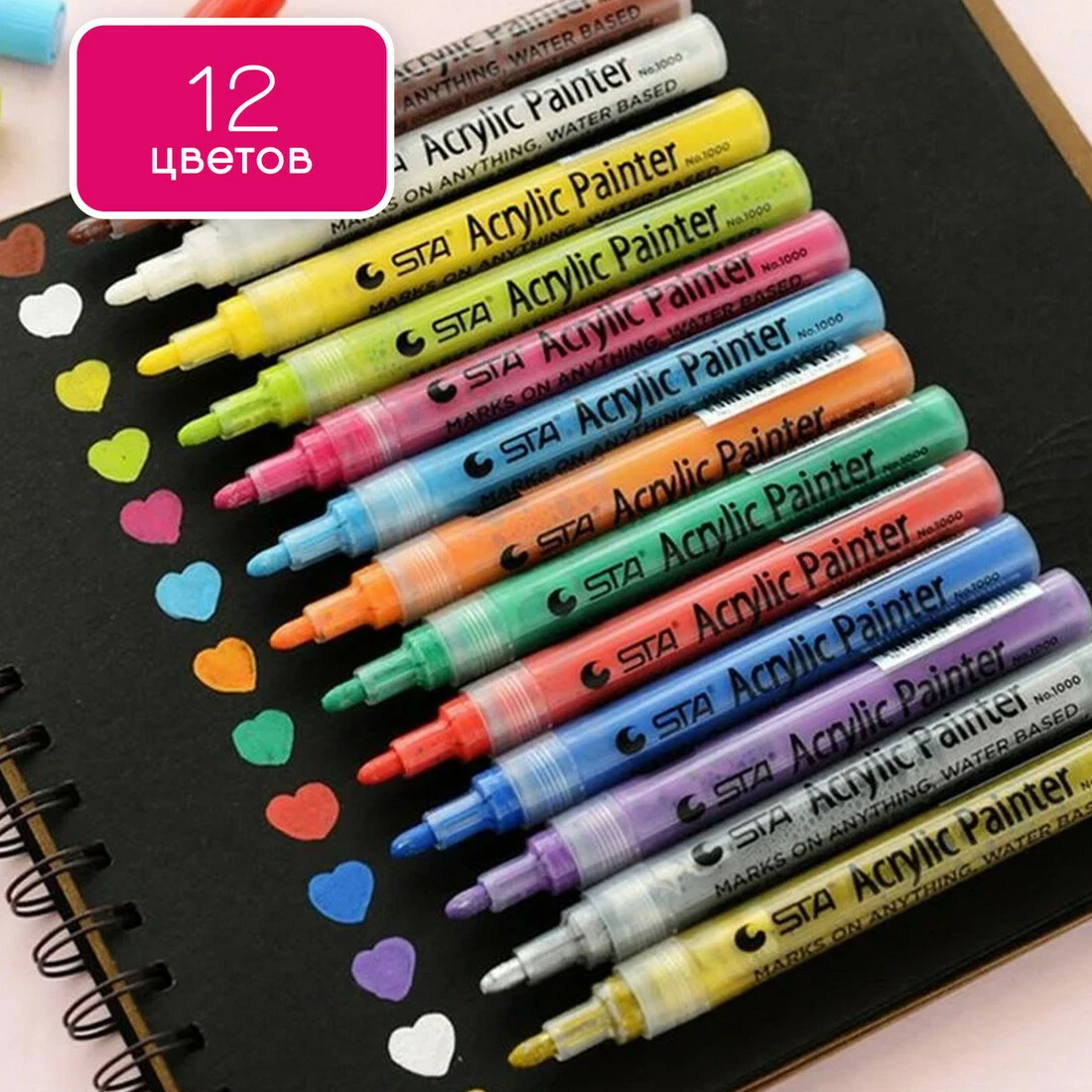 Набор разноцветных акриловых маркеров STA 12 для рисования на разных поверхностях, Маркеры акриловые
