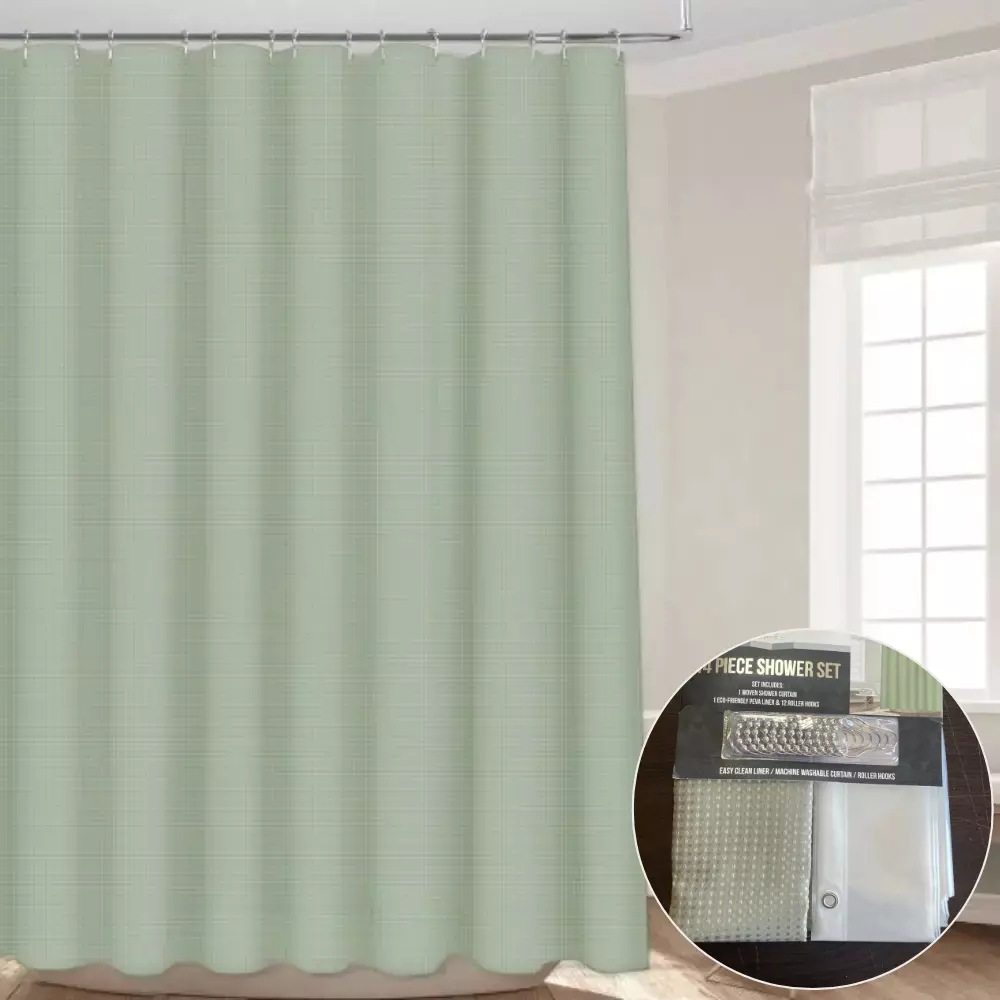 Набор шторка для ванной и душа 178x183 см,штора с подкладкой для ванной с крючками,зелёная, жаккардовый узор