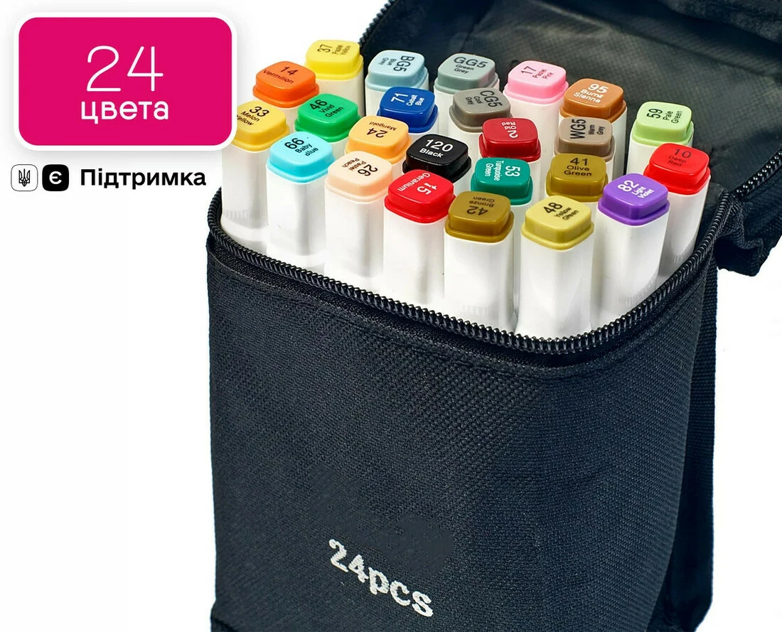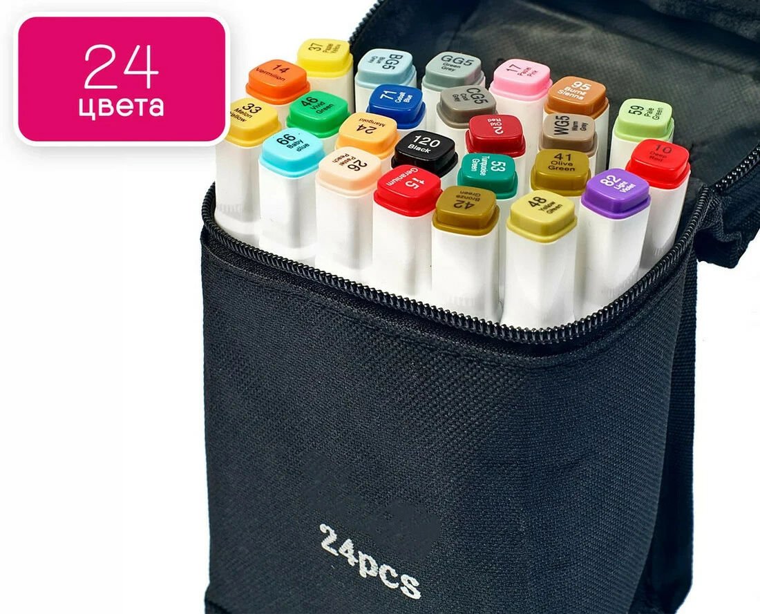 В наборе 24 маркеров разных цветов. Корпус пластиковый, гладкий. Колпачки плотно закрываются. Для удобства распознавания типа пера концы маркеров окрашены разным цветом.