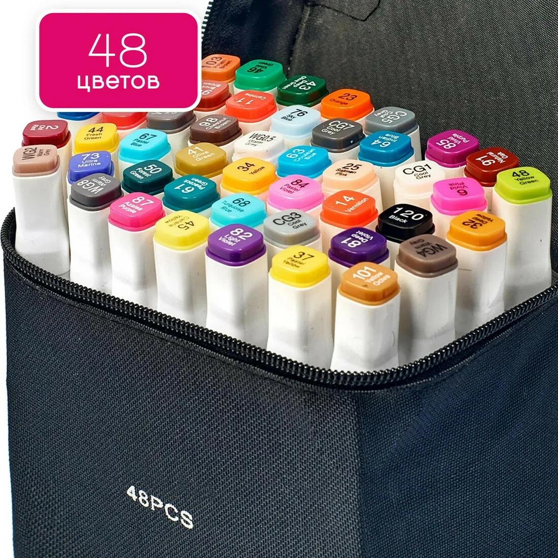 В наборе 48 маркеров разных цветов. Корпус пластиковый, гладкий. Колпачки плотно закрываются.