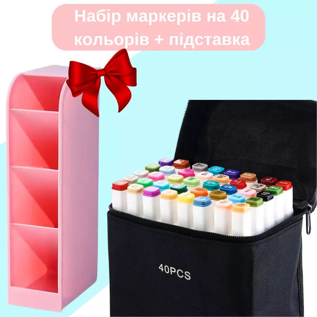 Набор спиртовых маркеров двусторонних Touch Smooth для рисования 40 штук+Подставка канцелярская розовая