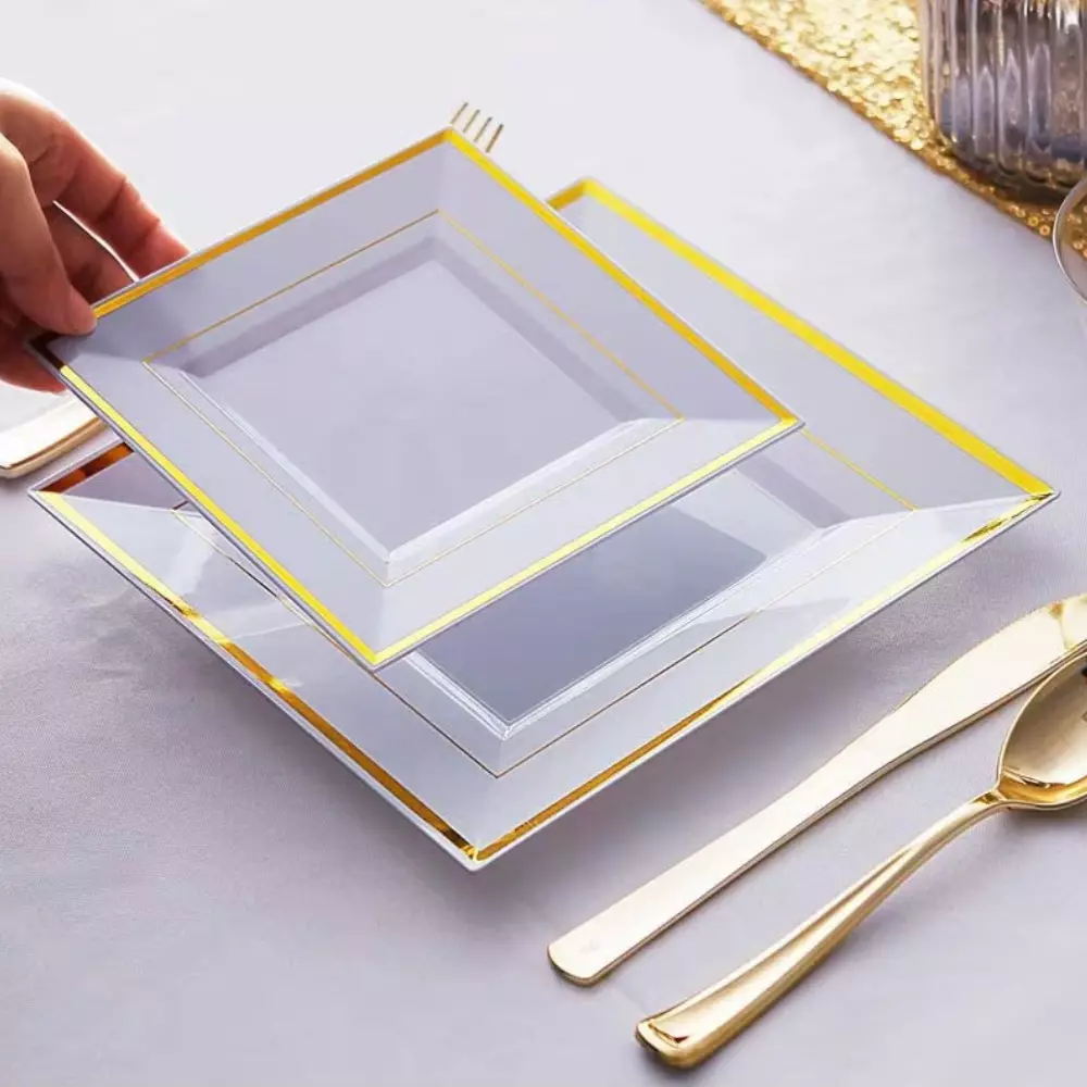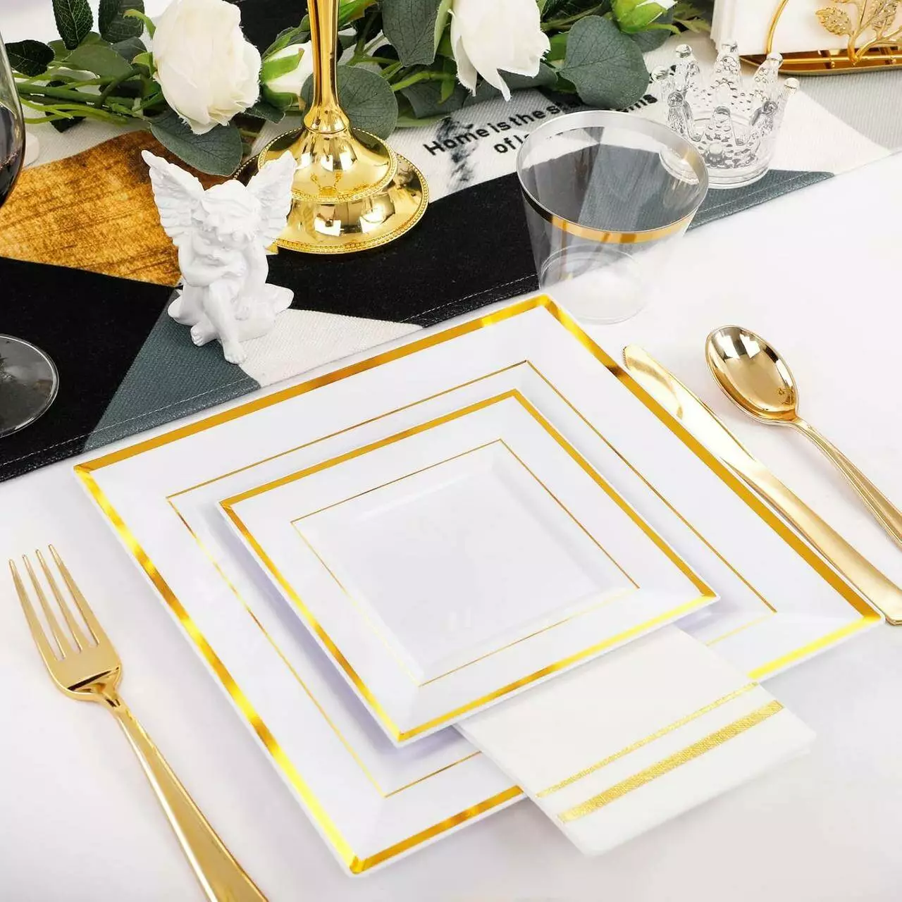 Набор тарелок пластиковых 12 шт квадратные,десертные 16.5 см и обеденные 24 см, с золотистым контуром