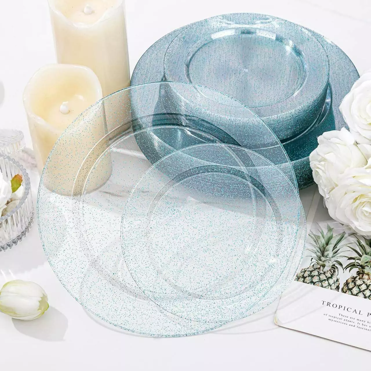 прозрачные тарелки с блёстками придают посуде изысканный и