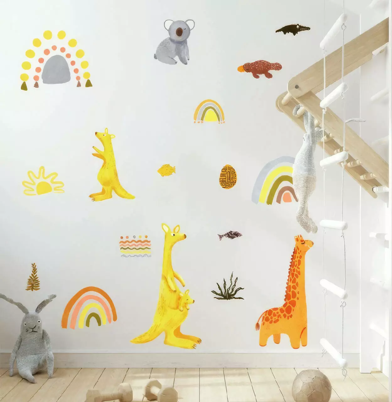 Набор виниловых наклеек "Зоопарк" превратит любую детскую комнату в настоящий уголок приключений. Красочные изображения жирафа, двух кенгуру, коалы, крокодила и утконоса наполнят пространство атмосферой дикой природы и радости. Дополняющие композицию наклейки радуги и солнца придадут интерьеру теплую и жизнерадостную атмосферу.