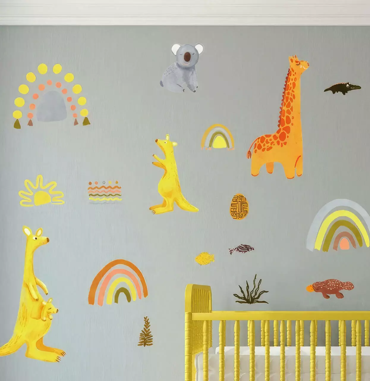 Изображения жирафа, двух кенгуру, коалы, крокодила, утконоса, радуги и солнца.