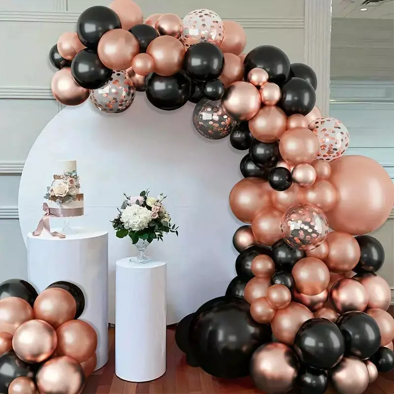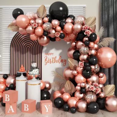 Этот комплект воздушных шаров представляет собой идеальный вариант для оформления торжественных мероприятий, таких как дни рождения, свадьбы, вечеринки или фотосессии. Шары выполнены в изысканном сочетании цветов: розовое золото, черный и бронза. Набор включает шары разных размеров и оттенков, что позволяет создать объемные и эффектные композиции для украшения пространства.