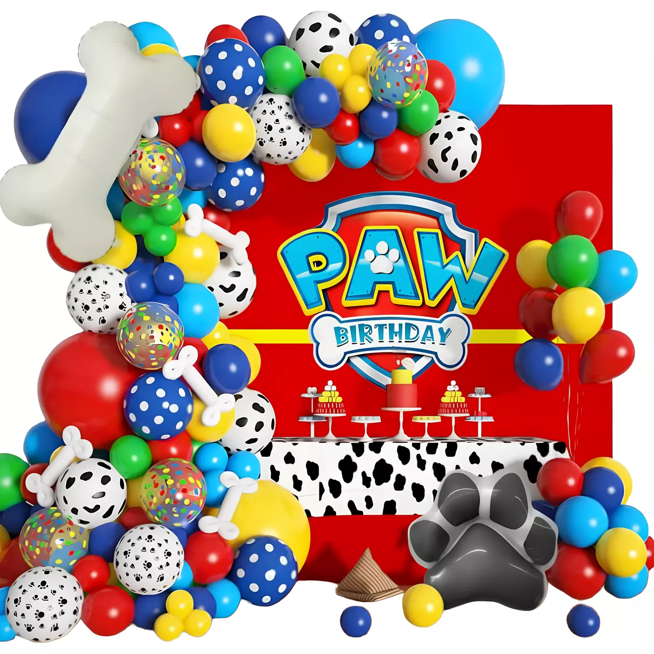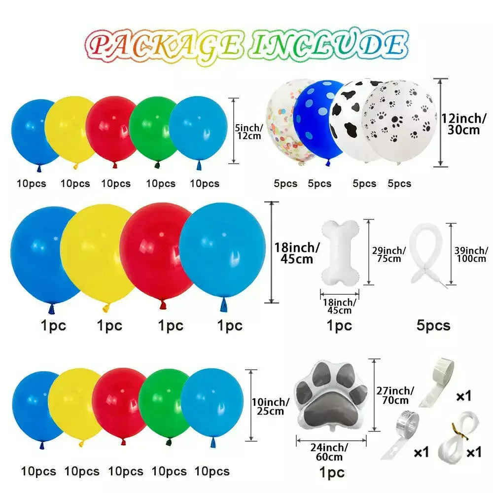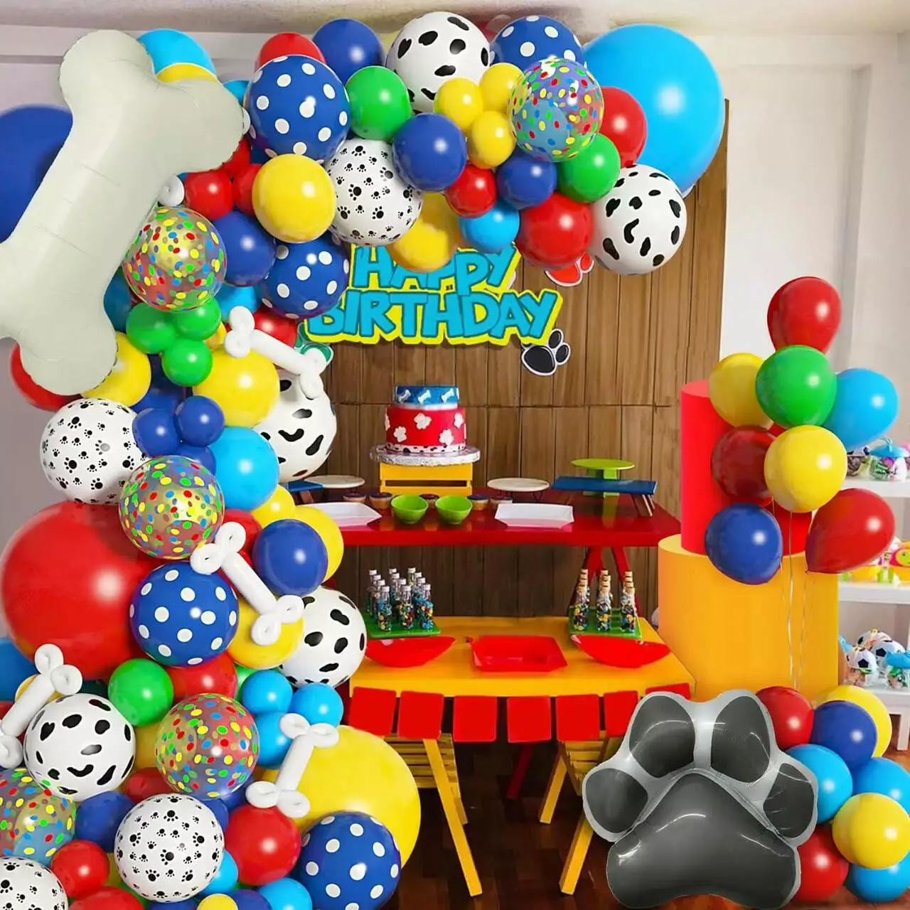 Набор включает в себя шары разных цветов (синий, красный, зеленый, желтый) и уникальные шары с рисунками, которые прекрасно подойдут для украшения вечеринки или фотозоны. Оригинальные элементы, такие как шар в виде кости и отпечаток лапы, добавят дополнительную изюминку. Эти шары также можно использовать для создания арок и других композиций, которые станут центральным элементом любого праздника.