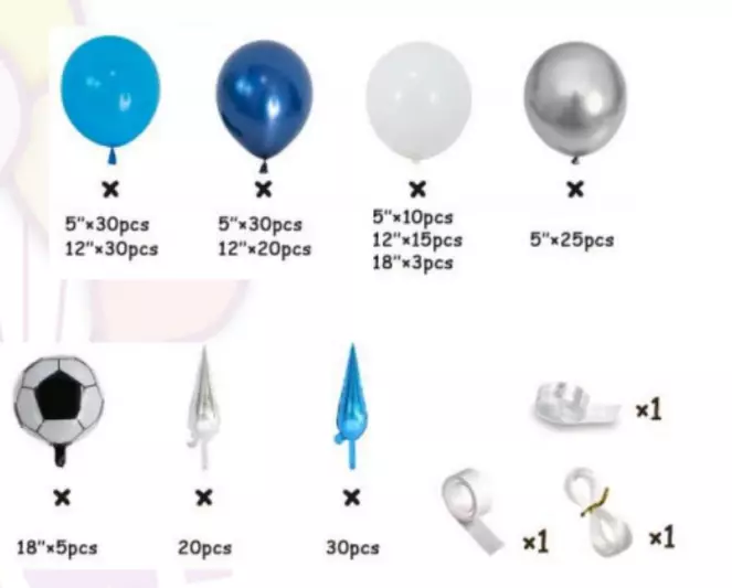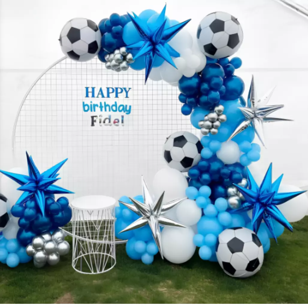 В наборе предусмотрены разнообразные элементы: воздушные шары различных размеров, в том числе специальные шары в виде футбольного мяча, а также декоративные гирлянды для добавления объема. Разнообразные насадки и крепления помогут легко оформить зону празднования и создать гармоничный и стильный декор.