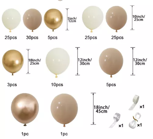 В комплект входят шары разных диаметров: от небольших 5-дюймовых до внушительных 18-дюймовых. Также представлены шары с различными текстурами — матовые и металлические, что придаст декору дополнительную глубину и объем. Золотые и румяные оттенки красиво сочетаются между собой и подойдут как для торжественных мероприятий, так и для камерных вечеринок.