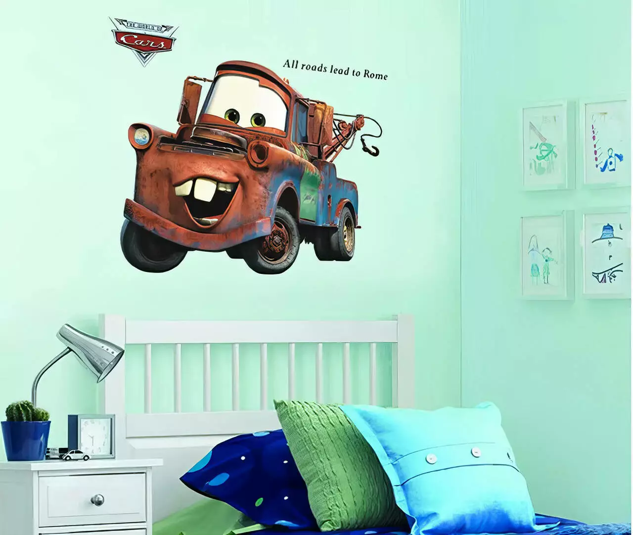 Детская виниловая наклейка "Тачки Мэтр" с надписью "All Roads Lead to Rome" станет стильным акцентом в комнате вашего мальчика. Размер 60х90 см делает наклейку заметным элементом интерьера, добавляя яркости и динамики. Изображение Мэтра — персонажа, полюбившегося детям, и тематическая надпись создают атмосферу приключений и скорости.