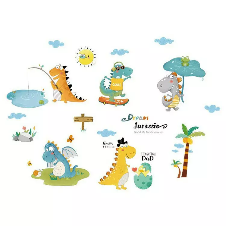 Этот набор виниловых наклеек станет ярким украшением детской комнаты, создавая атмосферу радости и приключений. Композиция включает в себя пятерых динозавров, которые весело проводят время на природе: они отдыхают, играют и наслаждаются окружающим миром. Каждый персонаж проработан с любовью к деталям, что делает рисунок особенно привлекательным для детей.