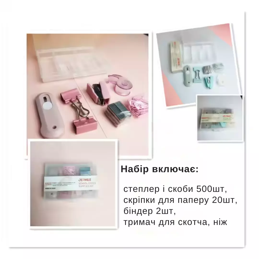 Комплектация: степлер и скобы 500шт, скрепки для бумаги 20шт, биндер 2шт, держатель для скотча, нож