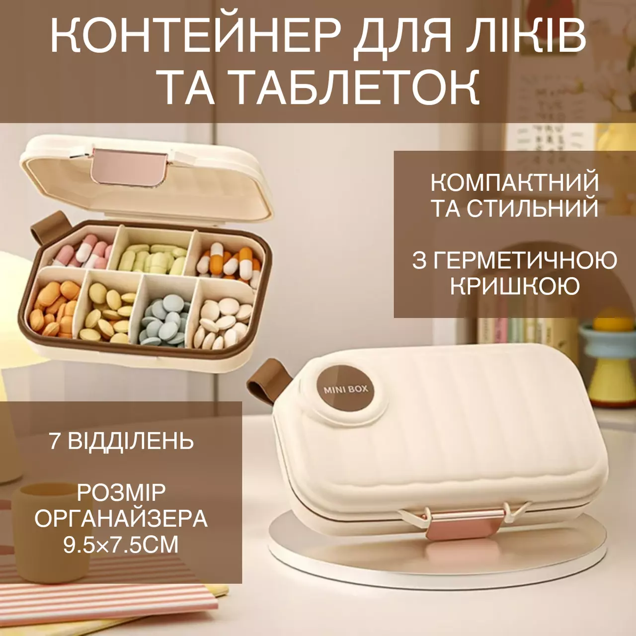Органайзер для таблеток с герметичной крышкой, контейнер для лекарств и таблеток, 9.5×7.5см, бежевый