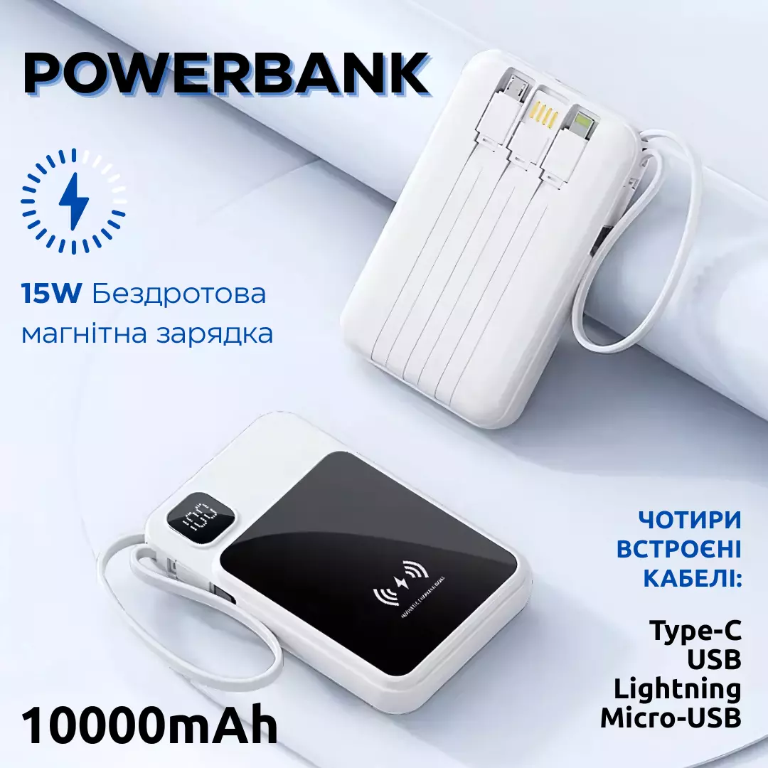 Павербанк беспроводной магнитный 10000мАч Powerbank с быстрой зарядкой, 4 встроенными кабелями, белый