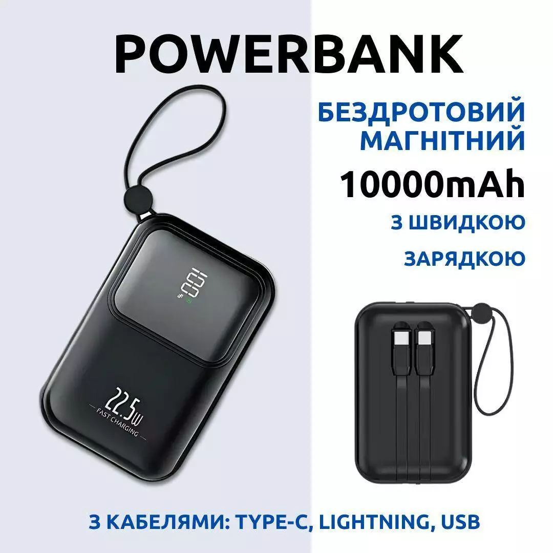 Павербанк беспроводной магнитный 10000мАч, Powerbank с кабелями Type-C/Lightning/USB, 22.5W Black