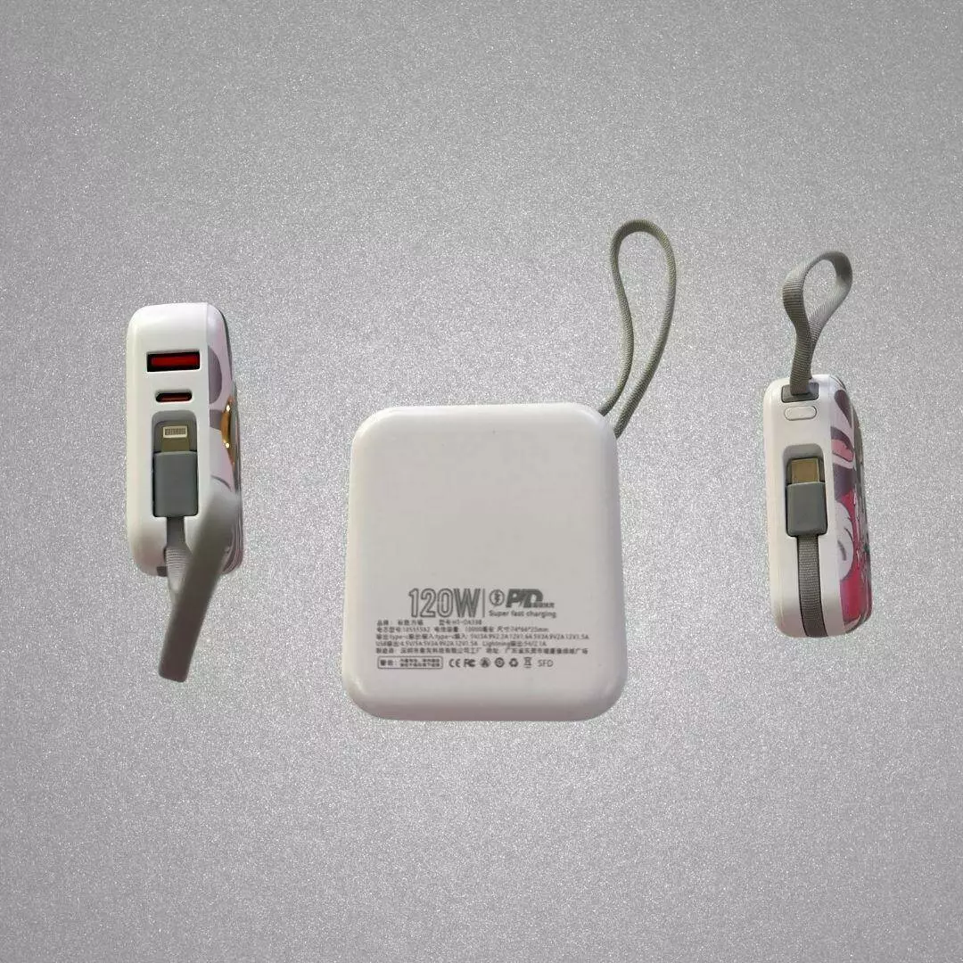 Павербанк с быстрой зарядкой 10000мАч, Power Bank с двумя встроенными кабелями Lightning и Type-C, 120W