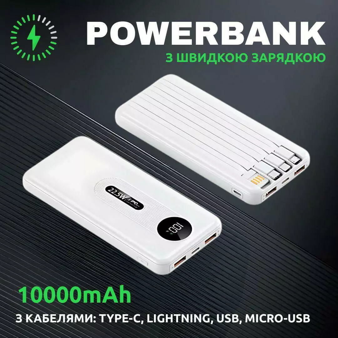Павербанк с быстрой зарядкой 10000мАч, УМБ Powerbank со встроенными кабелями 22.5W White