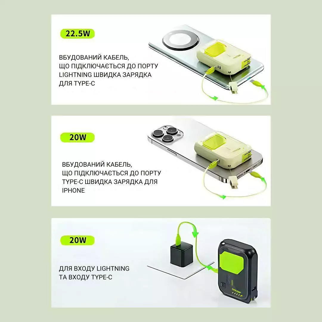 В комплект входит универсальный кабель Type-C/Lightning. Прочный корпус из ABS-пластика защищает от внешних повреждений, а светодиодная индикация показывает уровень заряда.