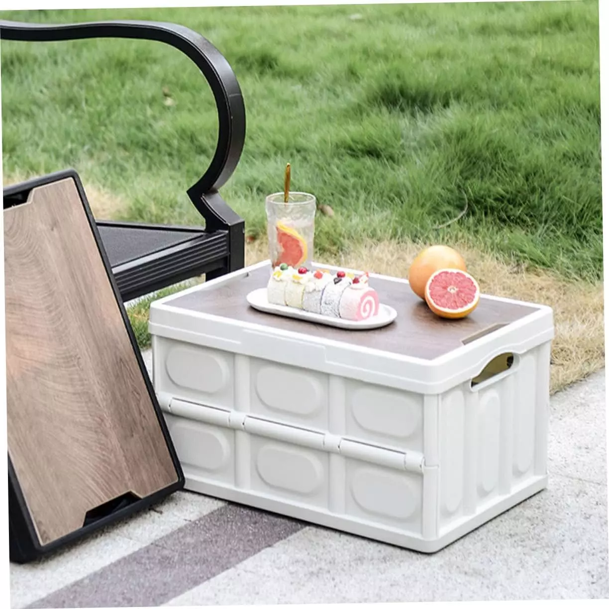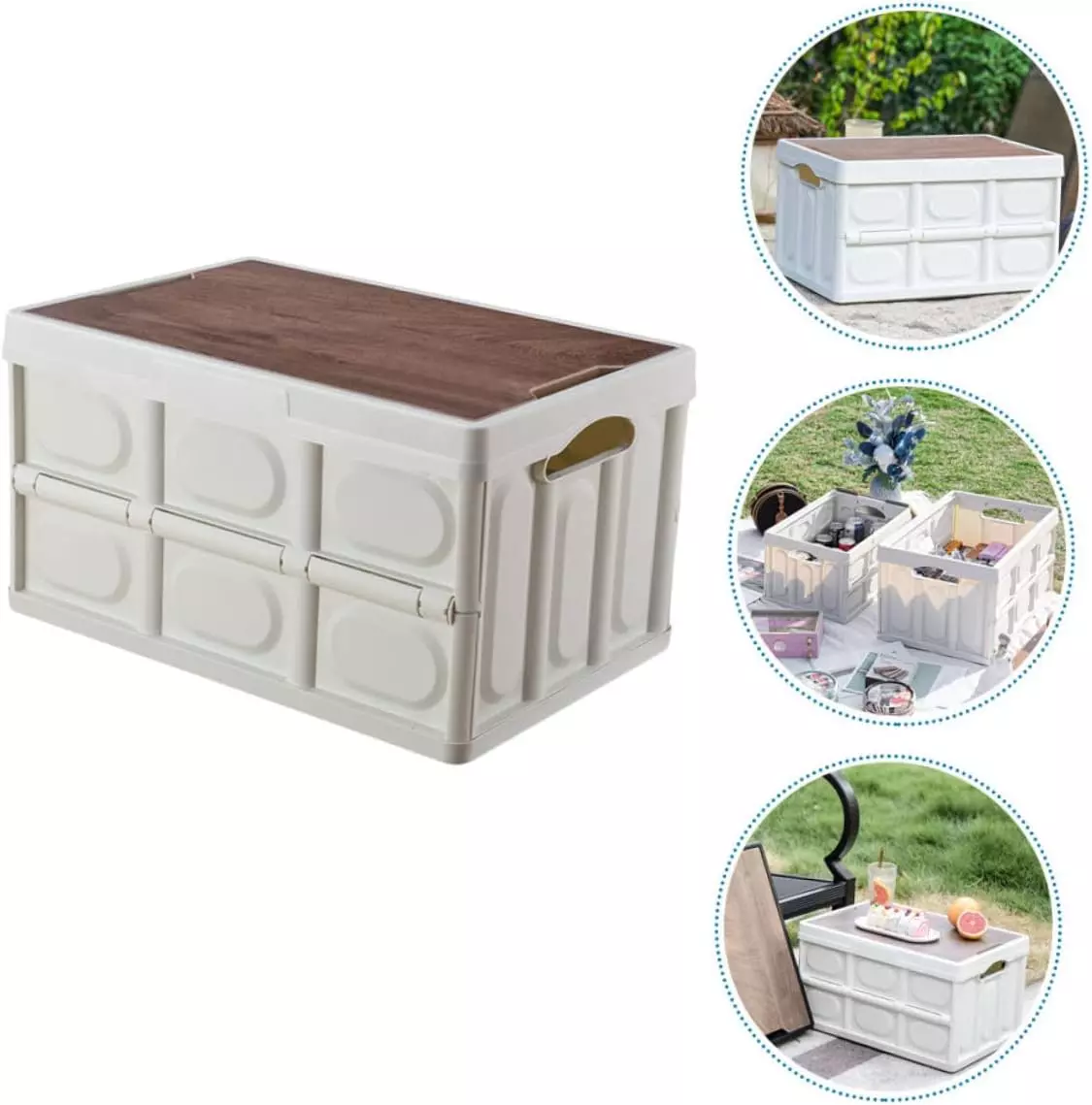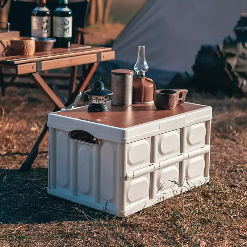 Контейнер оснащён прочной деревянной крышкой, которая надёжно закрывает содержимое, защищая его от пыли и влаги. Этот органайзер отлично подходит для кемпинга, багажника автомобиля или использования в доме. Складная конструкция облегчает транспортировку и хранение, а качественный пластик обеспечивает долговечность и устойчивость к нагрузкам.