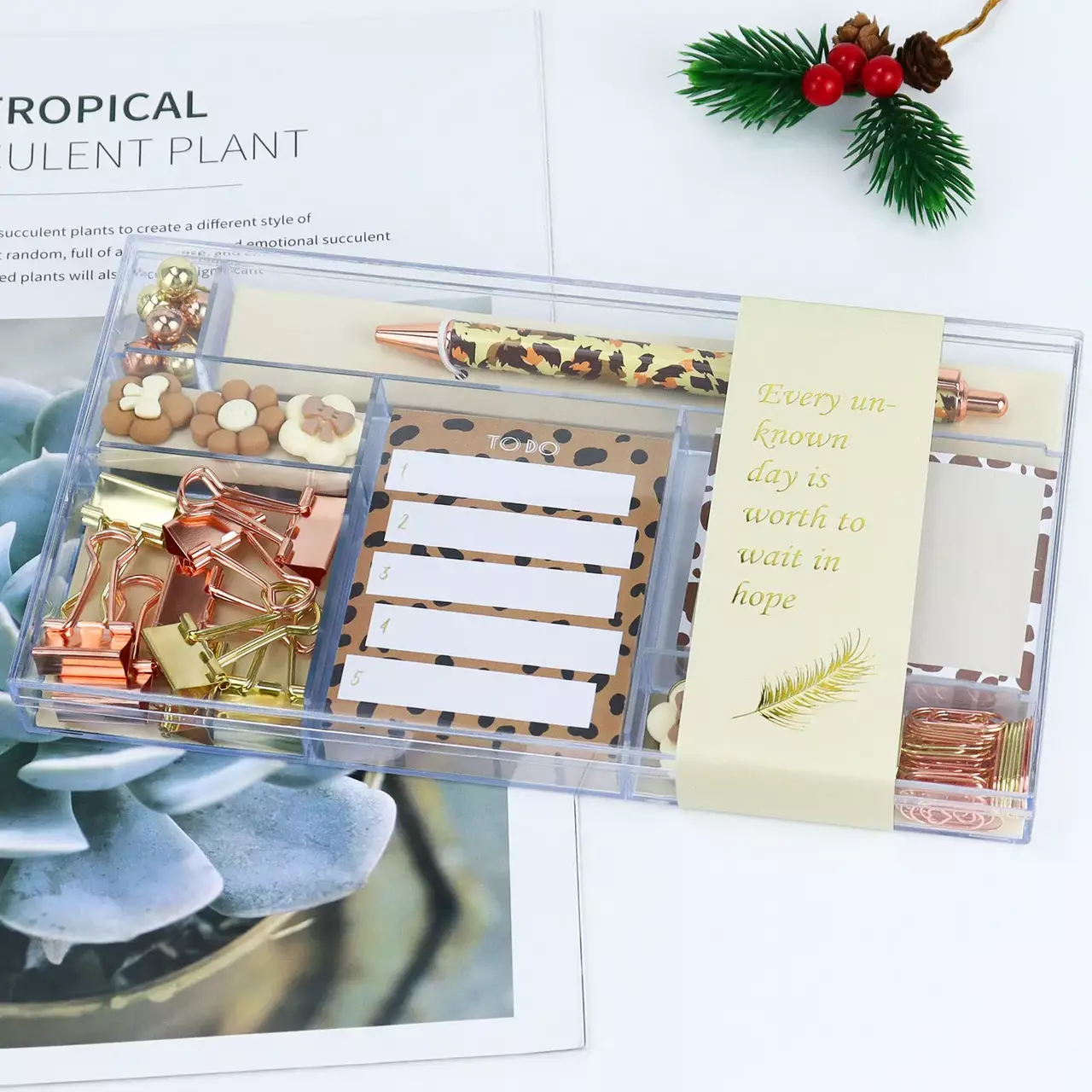 Подарочный набор канцелярии для учебы и работы, органайзер, ручка, скрепки и стикеры, леопардовый бокс