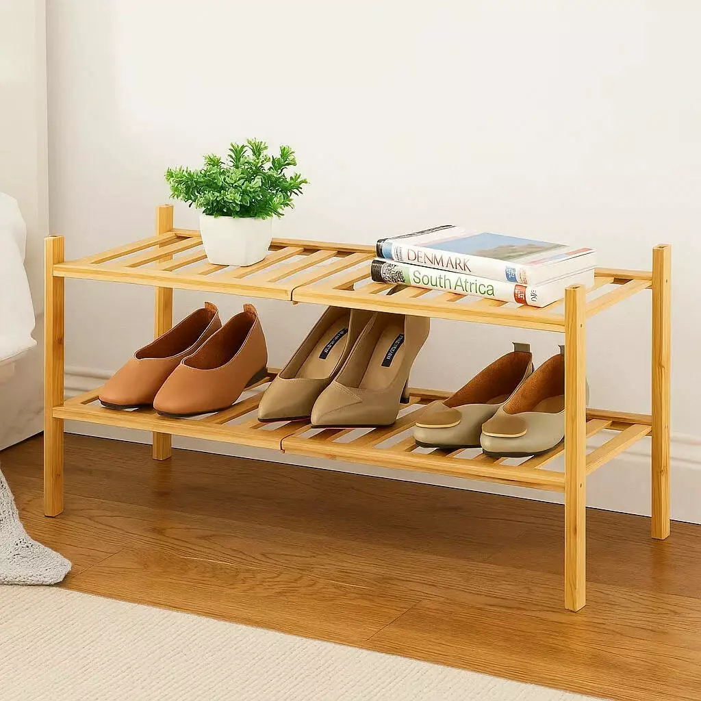 Полка оснащена двумя уровнями, что позволяет удобно разместить до 6 пар обуви. Верхнюю полку также можно использовать для хранения различных мелочей — книг, сумок, аксессуаров или декора. Конструкция с реечными полками обеспечивает хорошую вентиляцию, что особенно важно для хранения обуви.