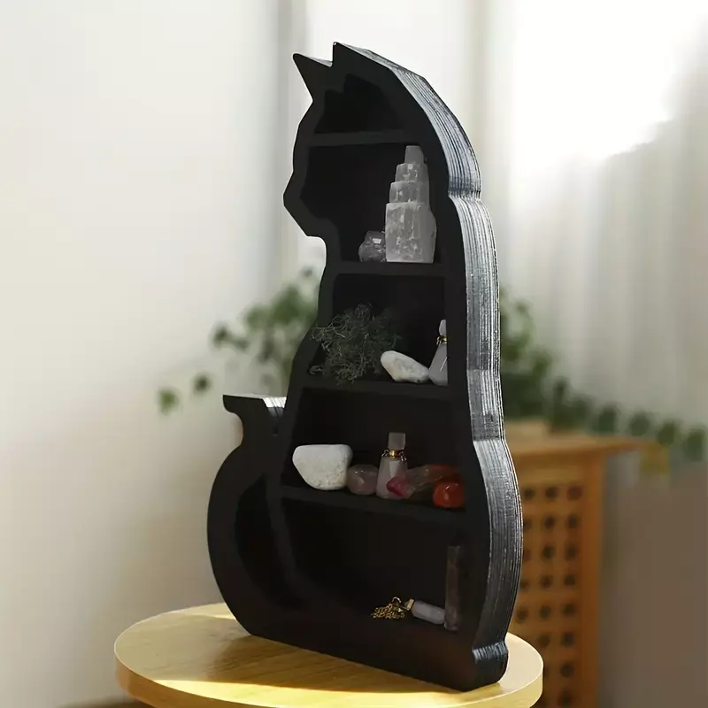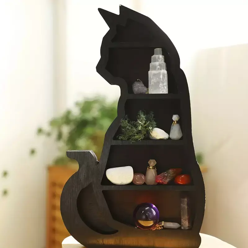 Полка настенная из дерева для декора и украшений, открытая полка на стену "Черный кот", размер 20×35×8см
