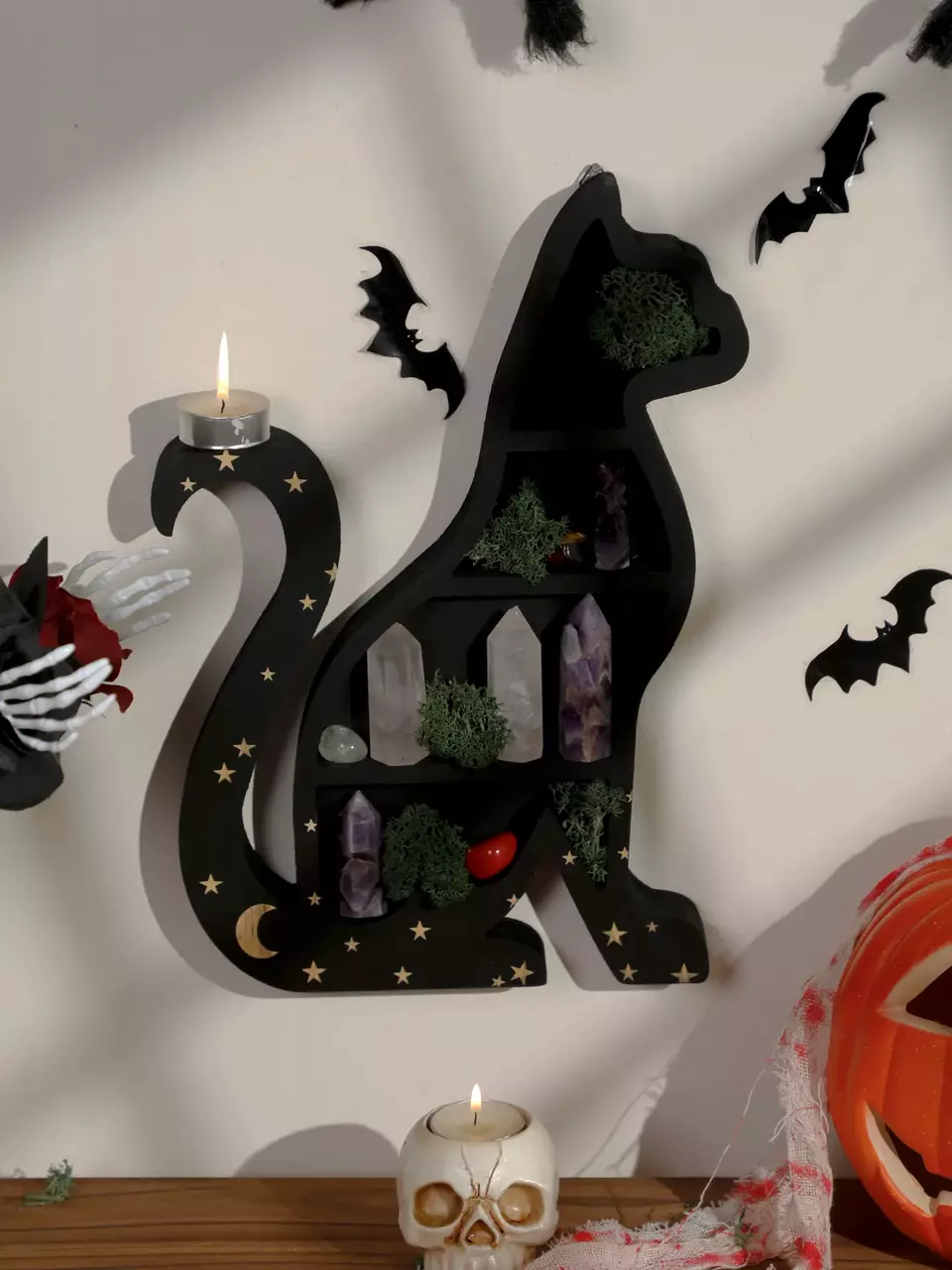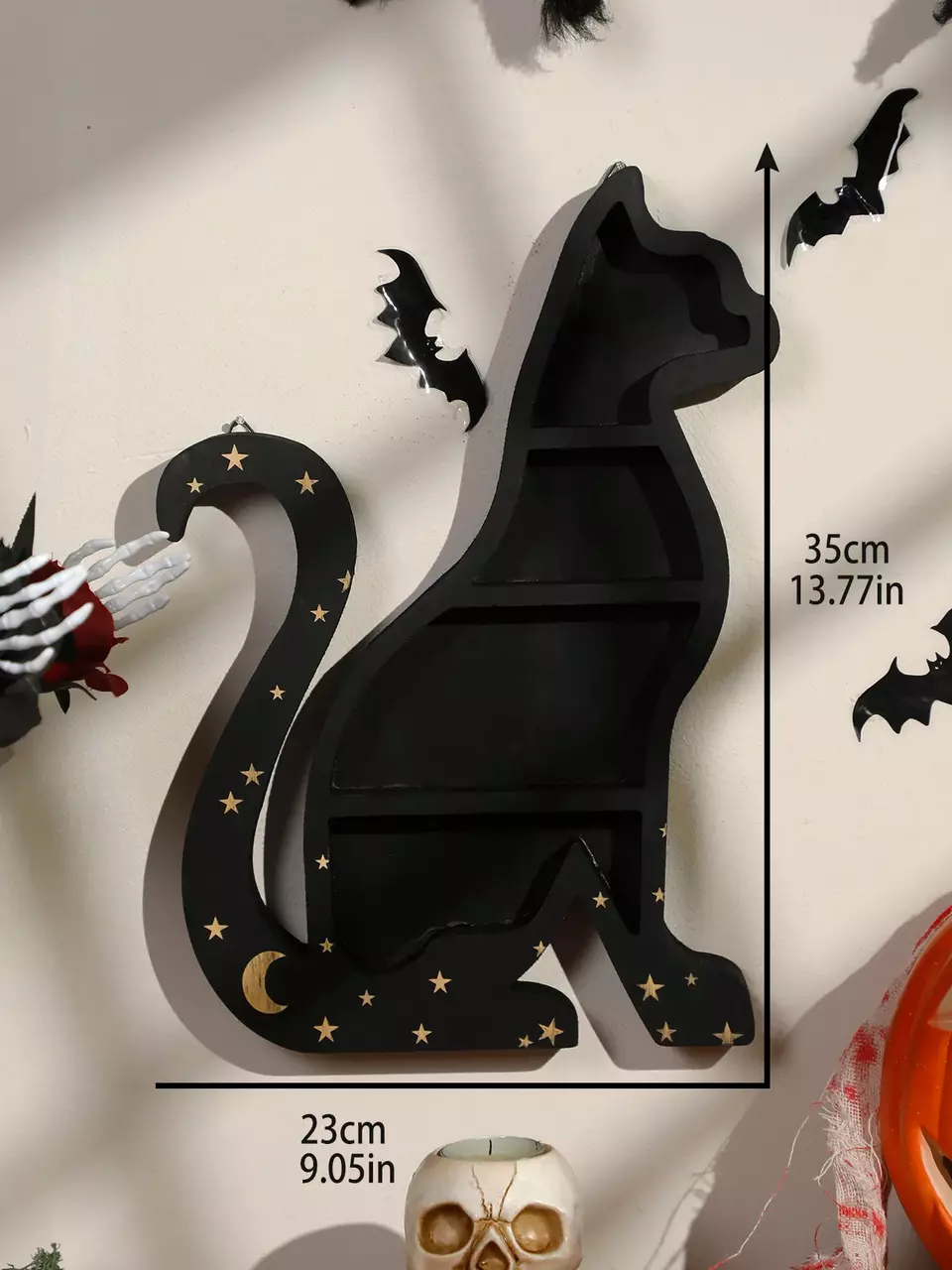 Полка настенная из дерева Кошка, полка деревянная для для украшений, черная со звездами, в размере 35×23см