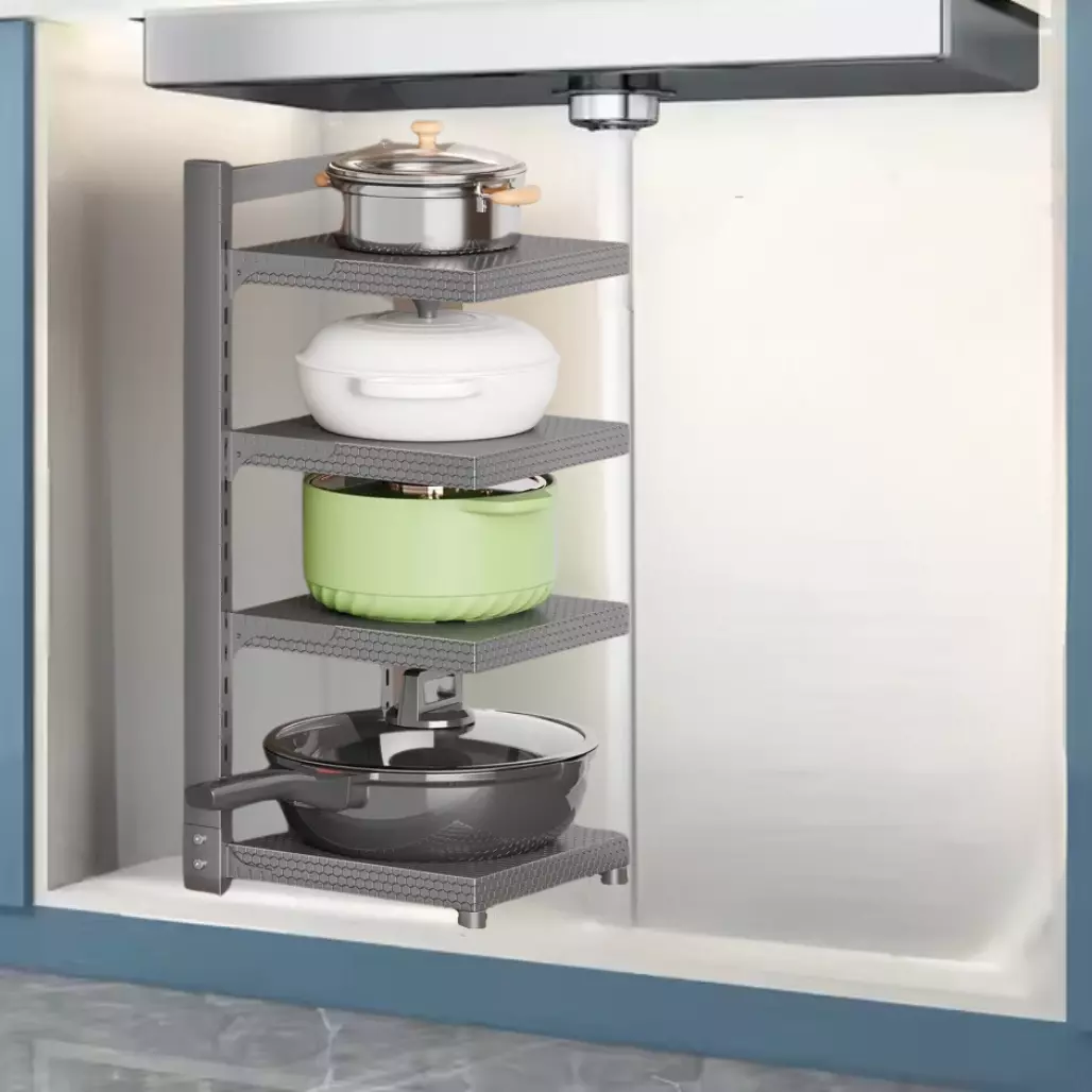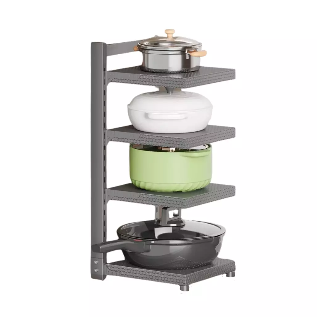 Полка-подставка для кастрюль кухонная четырехуровневая из углеродистой стали с четырьмя съёмными полками ,сера