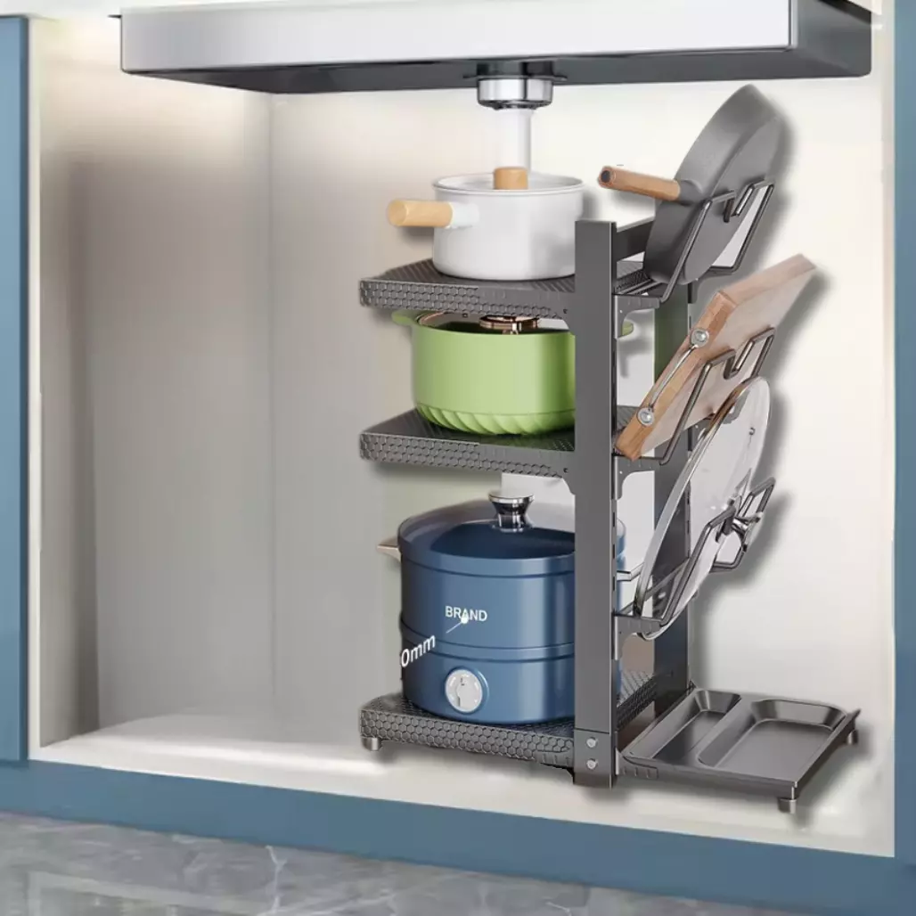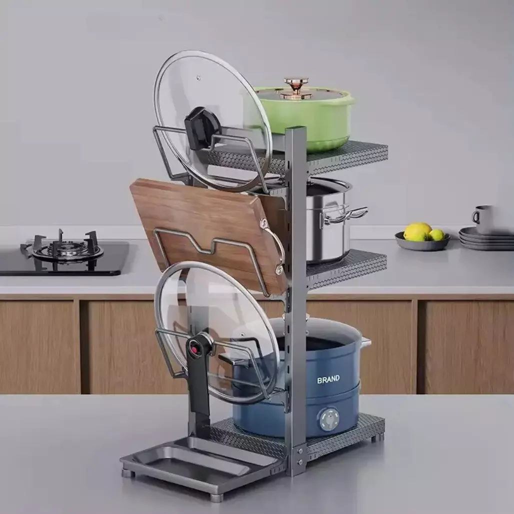 Каждая полка и держатель для крышек полностью съемные, что делает конструкцию универсальной и легко настраиваемой. Полка оснащена двухсторонним доступом, обеспечивая удобство использования с обеих сторон. Такой дизайн значительно облегчает организацию кухонного пространства, позволяя оптимизировать хранение посуды и кухонных принадлежностей.