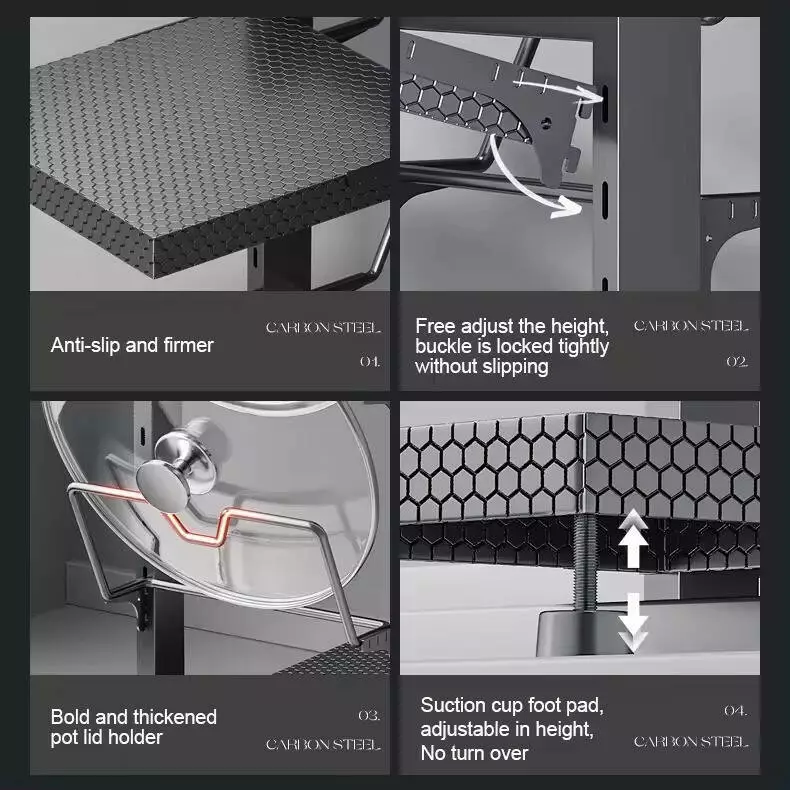 Изготовленная из прочной углеродистой стали, полка сочетает в себе надежность и функциональность. Регулируемые по высоте полки и два держателя для крышек позволяют адаптировать конструкцию под ваши нужды. Удобный лоток размером 20 х 17 см идеально подходит для хранения мелочей, таких как столовые приборы или кухонные принадлежности, помогая поддерживать порядок на рабочей поверхности.