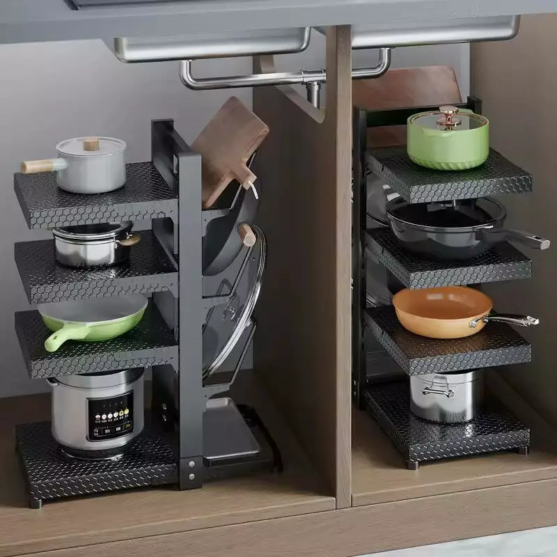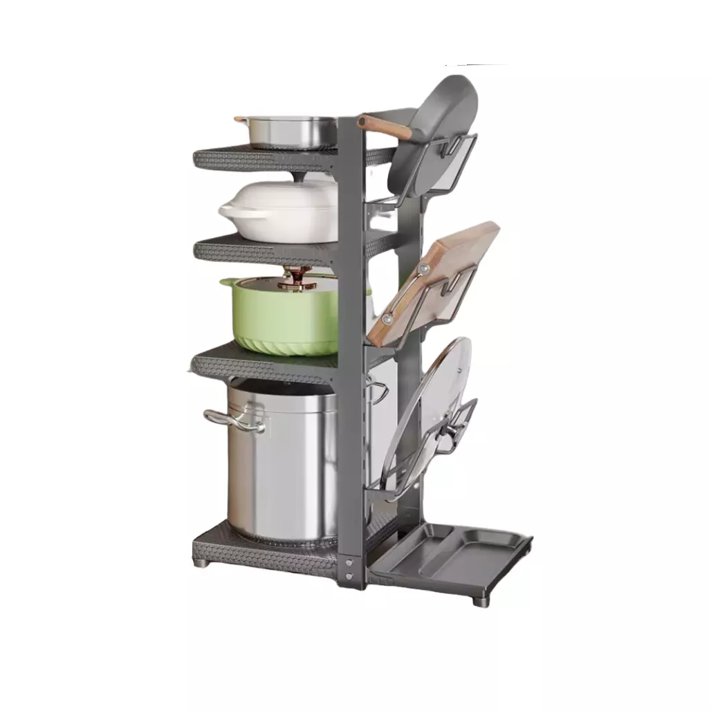 Полка изготовлена из прочной углеродистой стали, что обеспечивает надежность и долговечность. Съемные и регулируемые по высоте полки, а также три держателя для крышек позволяют адаптировать изделие под кастрюли и крышки разных размеров. Встроенный лоток размером 20 х 17 см идеально подходит для хранения столовых приборов, помогая поддерживать порядок на кухне.