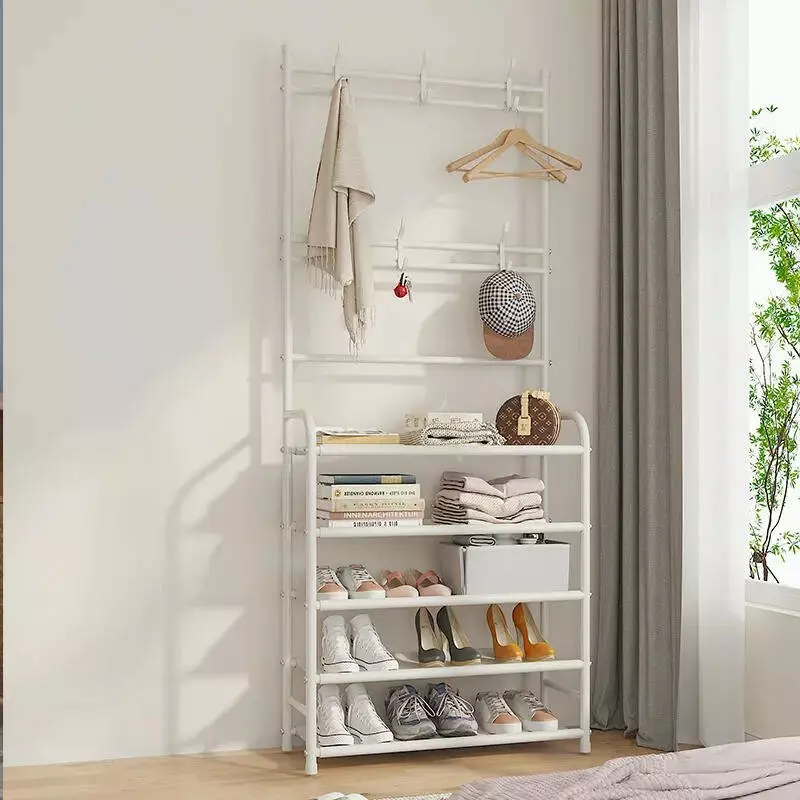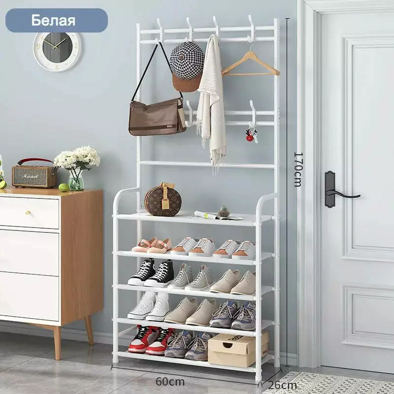 Полочка с вешаком для прихожей 25х60х150, Органайзер для обуви и одежды с 4 полками, Белого цвета