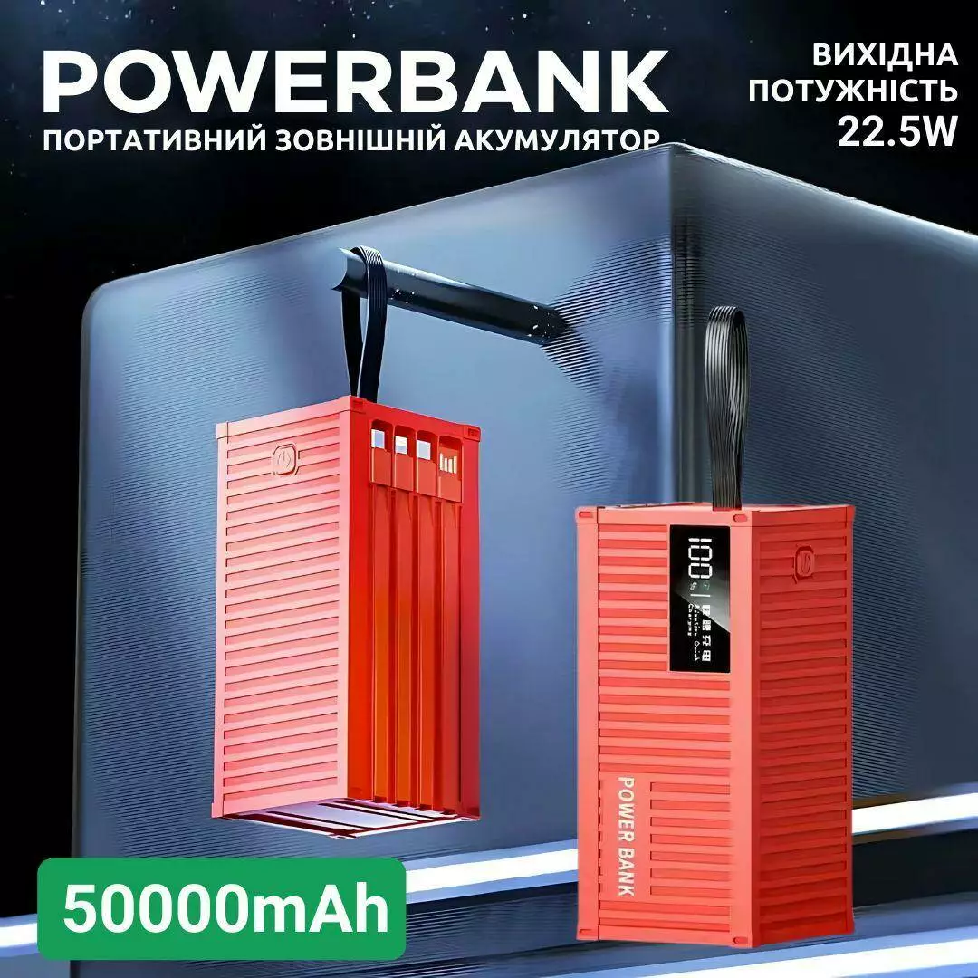 Портативный внешний аккумулятор, мощный павербанк 50000мАч, Powerbank с быстрой зарядкой и кабелями Red
